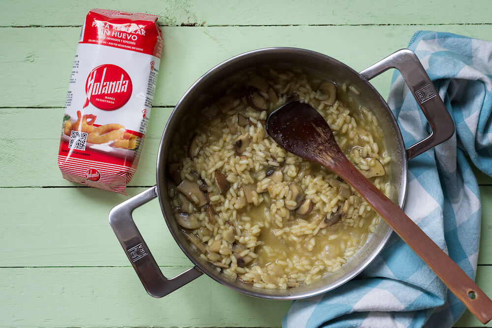 - 5. Seguimos añadiendo caldo poco a poco, removiendo, hasta que el arroz esté bien cocinado. Salpimentamos al gusto.