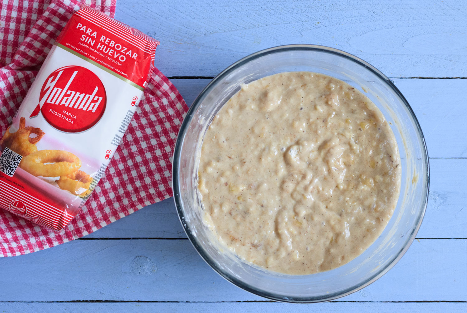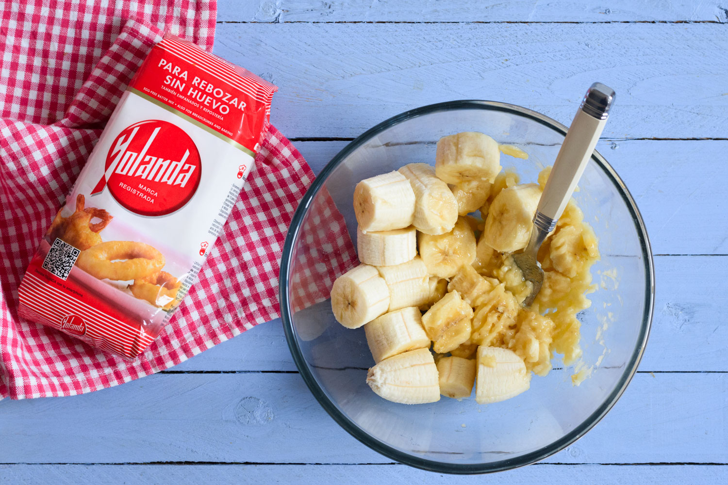- En un cuenco grande chafamos los plátanos hasta obtener un puré homogéneo.