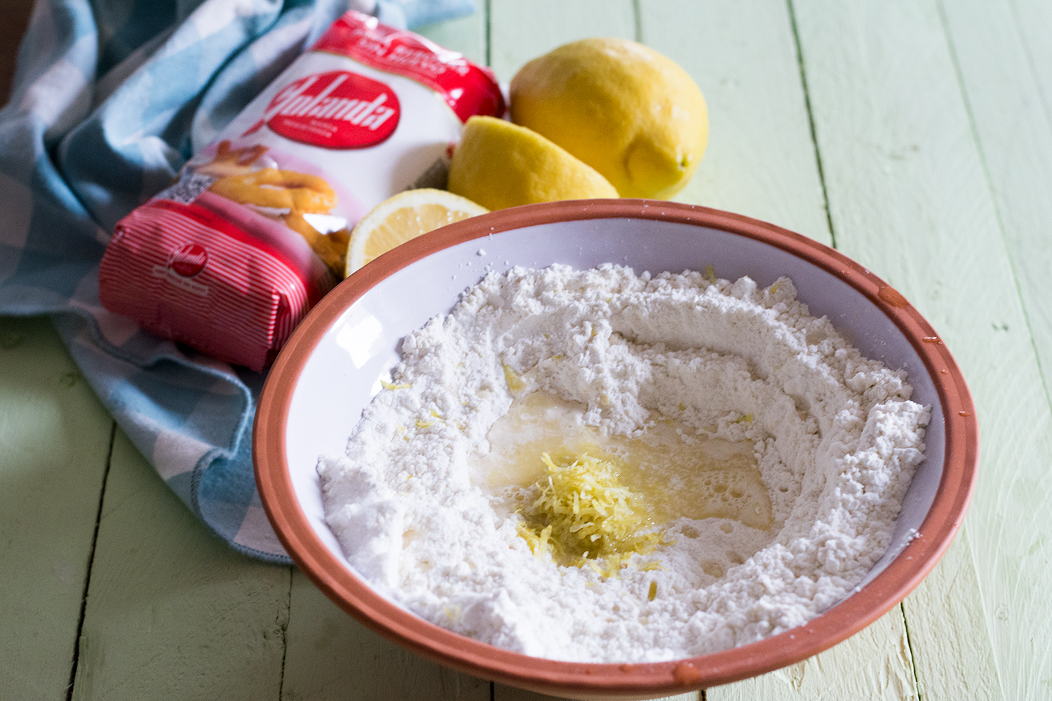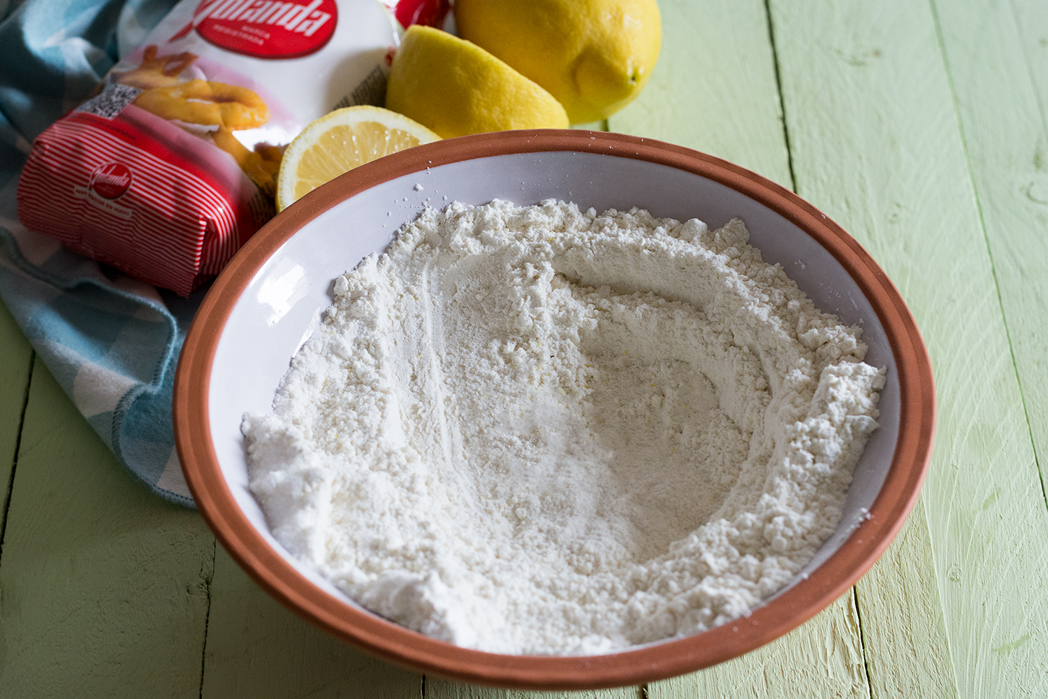 - En un cuenco grande tamizamos la harina Yolanda con la levadura. Añadimos el azúcar y mezclamos.