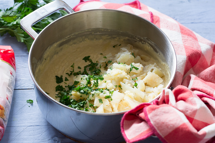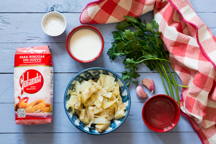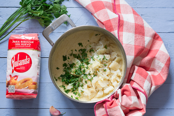 - 3. Añadimos el bacalao a trozos pequeños, el perejil picado y el diente de ajo machacado, salpimentamos y mezclamos todo bien.