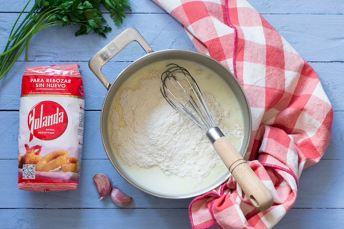 - 2. Ponemos una cacerola al fuego con la leche. Justo antes de que empiece a hervir sacamos del fuego y añadimos de golpe la harina. Removemos bien.