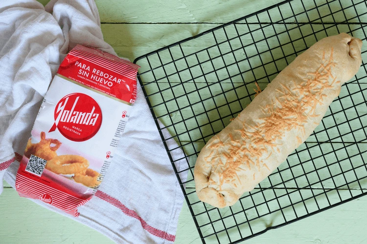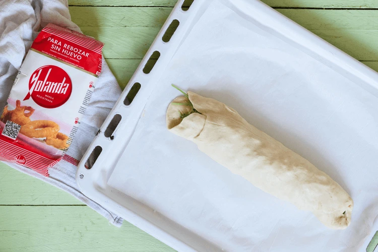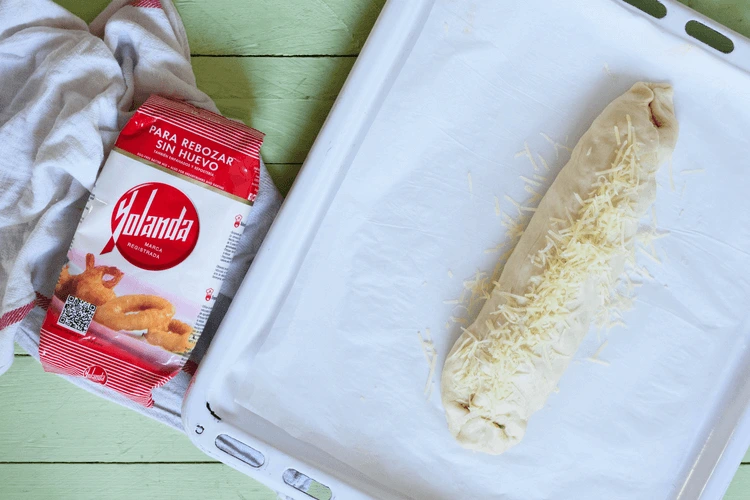 - Enrollamos, con cuidado, cerramos los bordes y cubrimos con queso rallado.