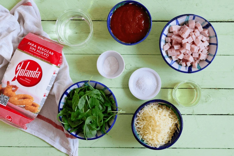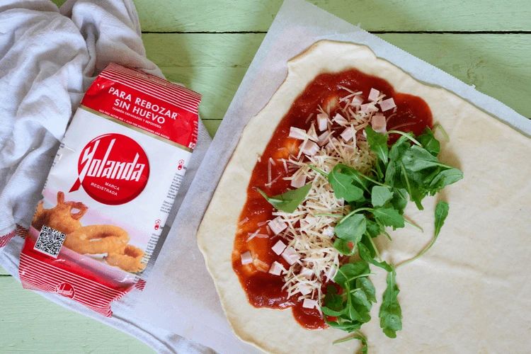 - Estiramos una de las masas dando forma rectangular y rellenamos con la salsa de tomate, el jamón de york, el queso rallado y la rúcula.