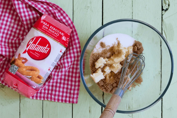 En un cuenco grande batimos la mantequilla con el azúcar moreno y blanco, una vez bien integrado añadimos la harina Yolanda, la levadura y la pizca de sal.