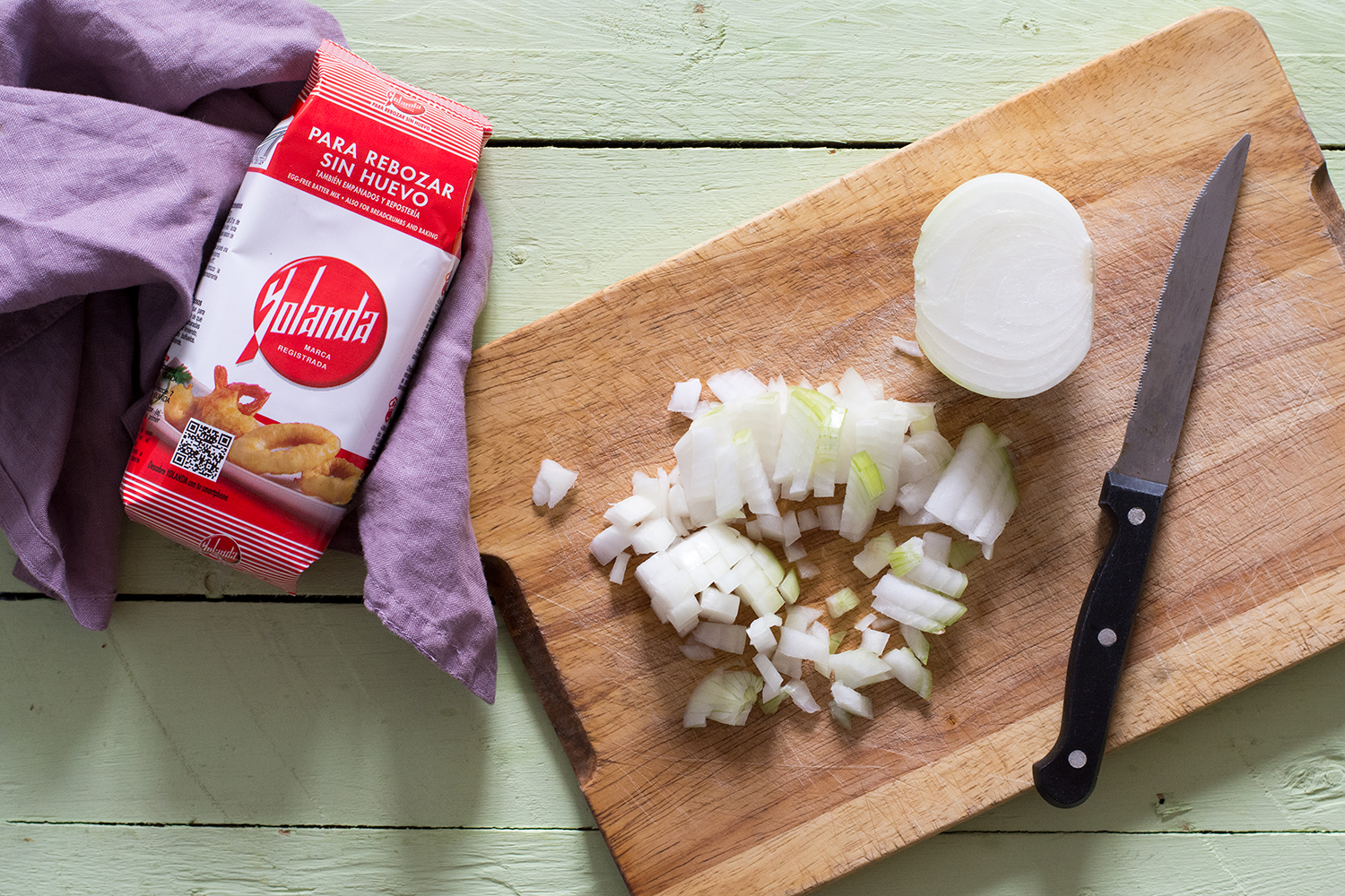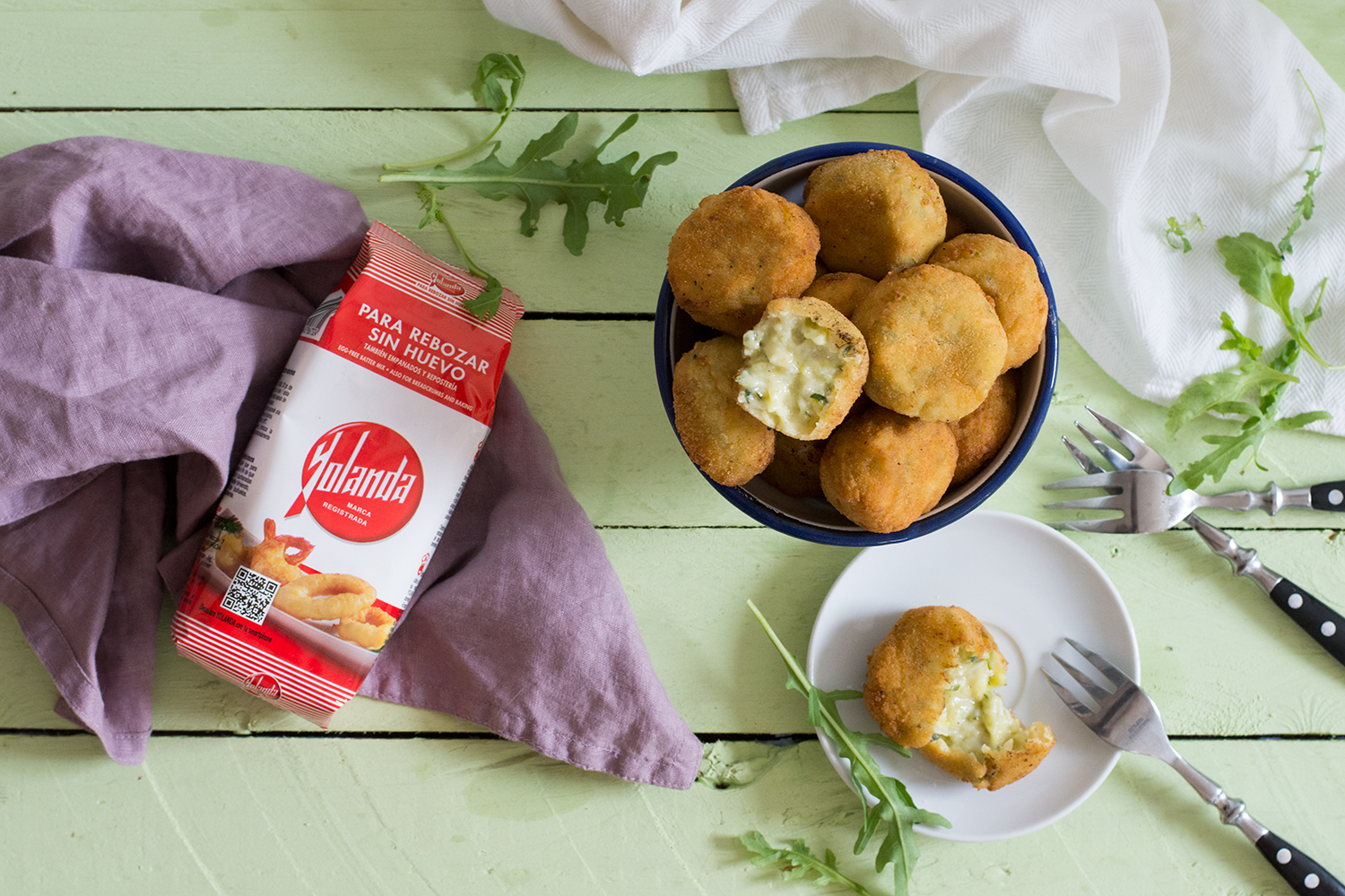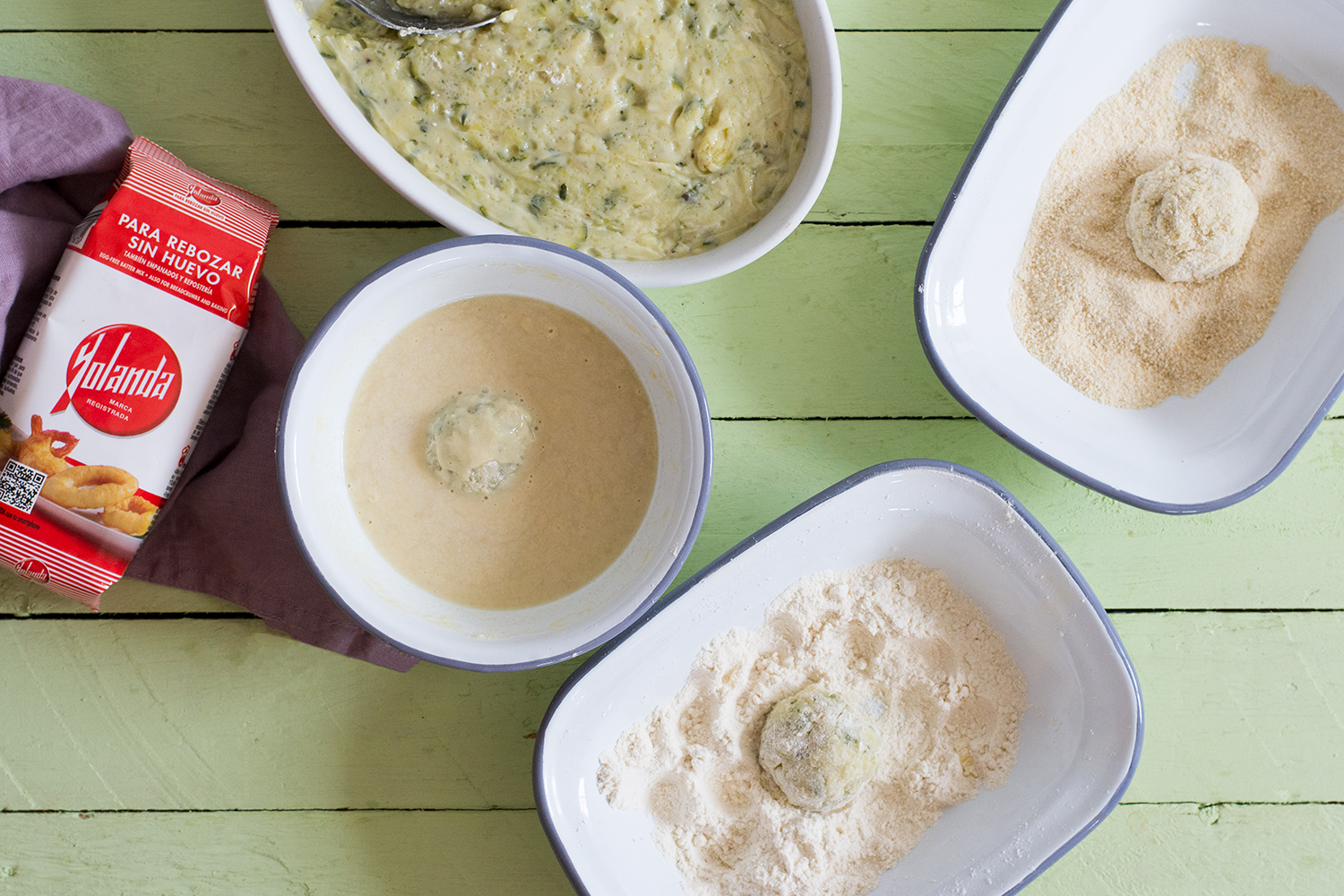 - En un cuenco mezclamos 50 gr de Harina Yolanda con 50 ml de agua. Vamos tomando pequeñas porciones de la masa, les damos forma redondeada y las pasamos por Harina Yolanda, después por la mezcla que hemos preparado y por último por pan rallado. Una vez listas, las freímos en abundante aceite vegetal muy caliente. Cuando comiencen a dorarse, las pasamos a un plato con papel absorberte hasta el momento de servir.