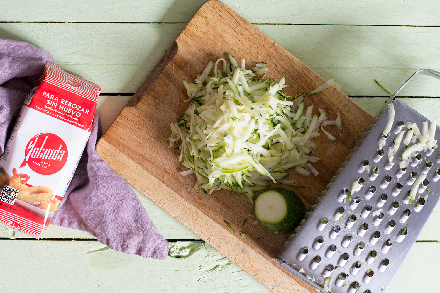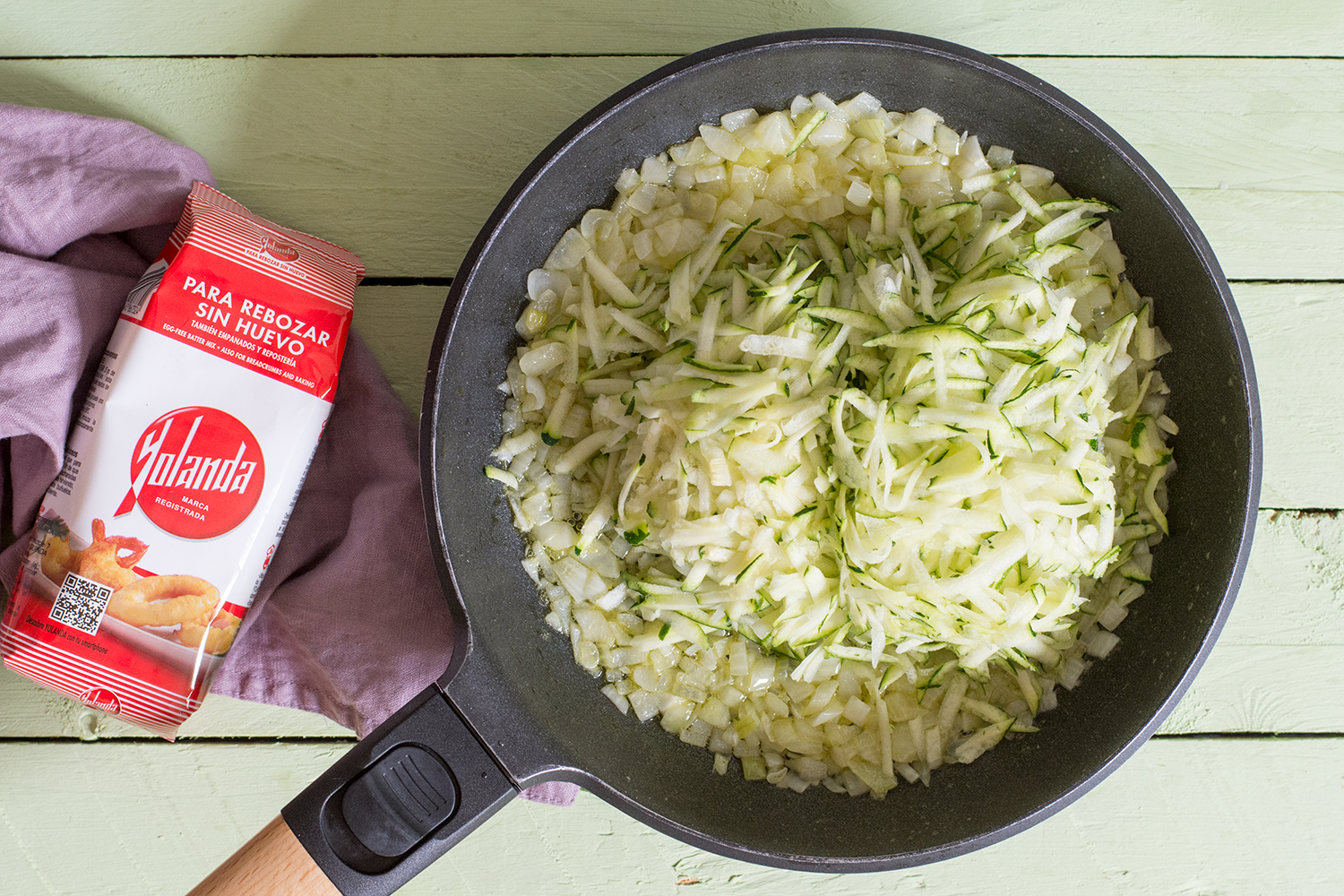 - Pelamos y picamos muy fina la cebolla. La ponemos a pochar en una sartén con un poco de aceite. Mientras rallamos el calabacín calabacín. Una vez que la cebolla comience a pocharse lo añadimos y cocinamos unos 8 o 10 min. hasta que veamos que comienza a dorarse.