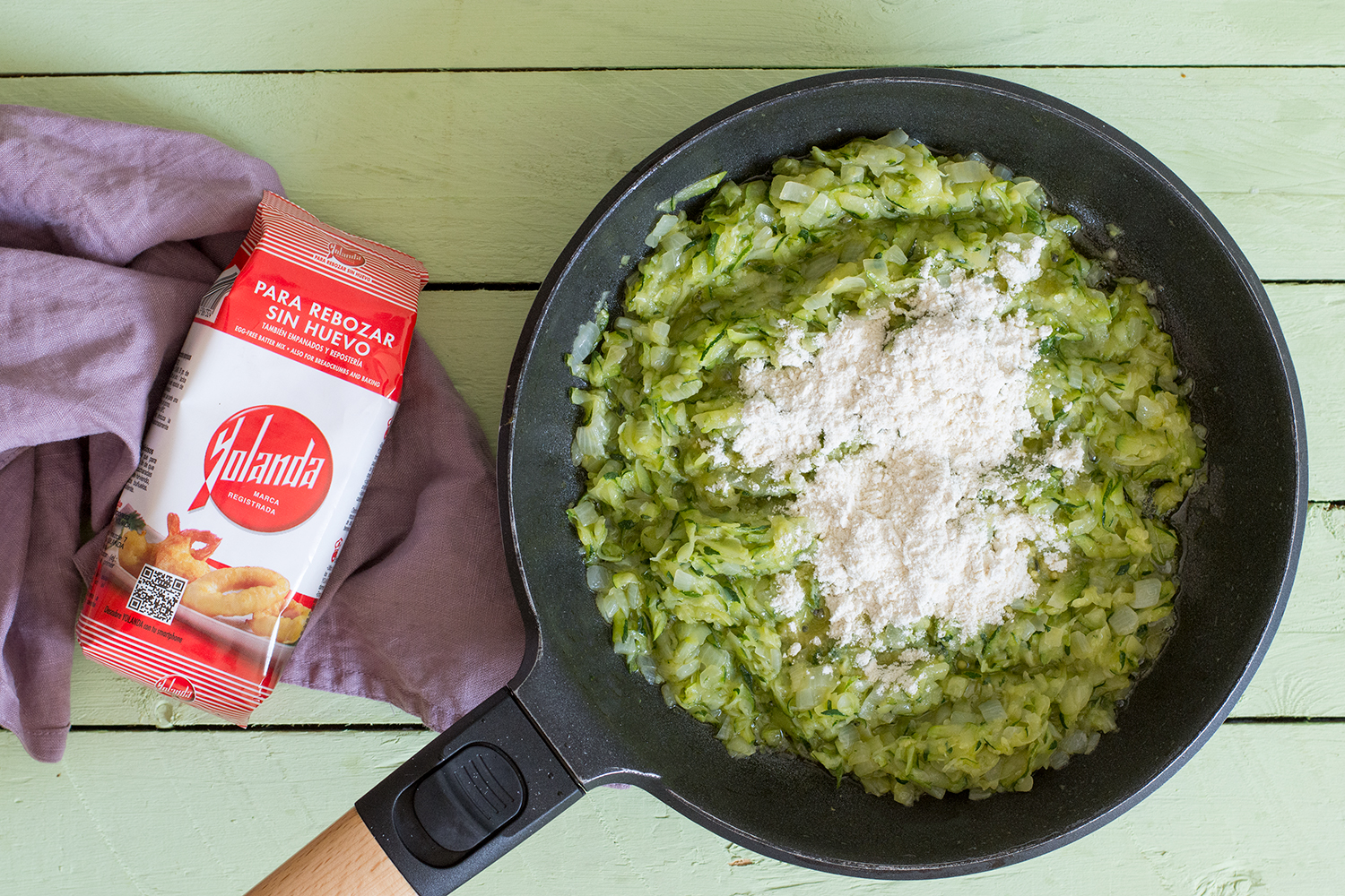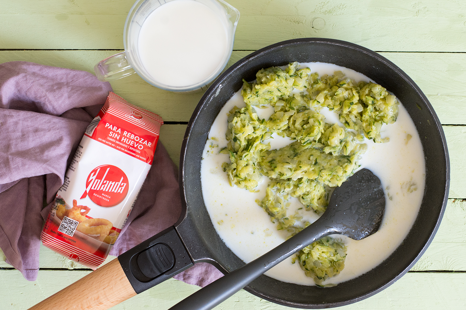 - En la misma sartén añadimos la Harina Yolanda, cocinamos sin dejar de remover hasta que veamos que comienza a tostarse, momento en que añadimos la leche, sin dejar de remover, hasta que veamos que comienza a espesar.