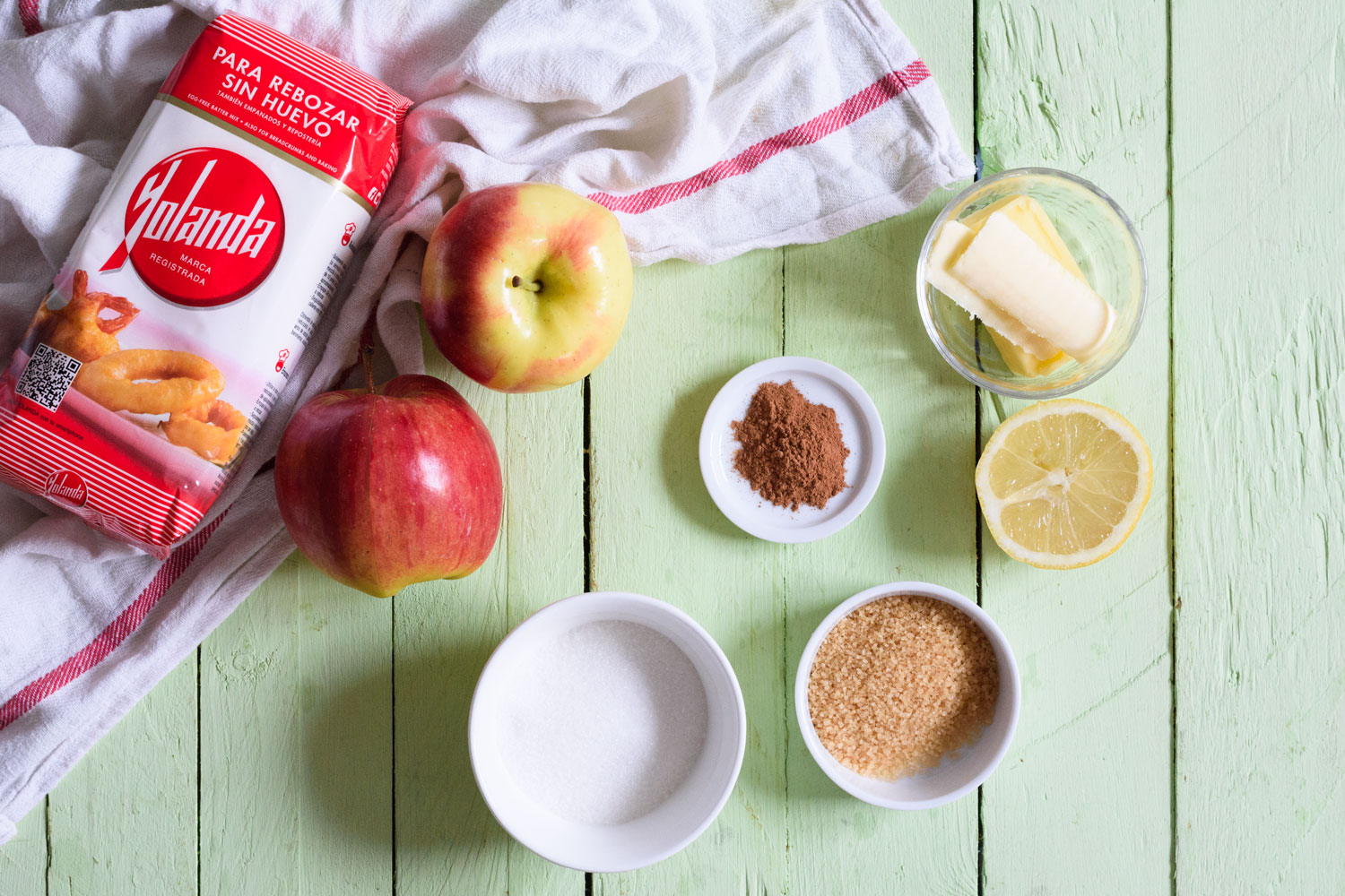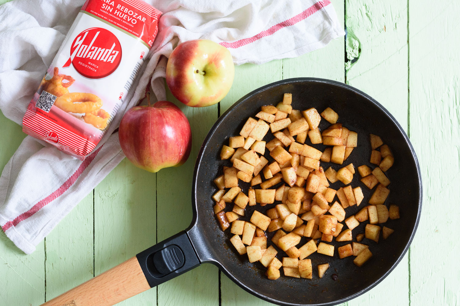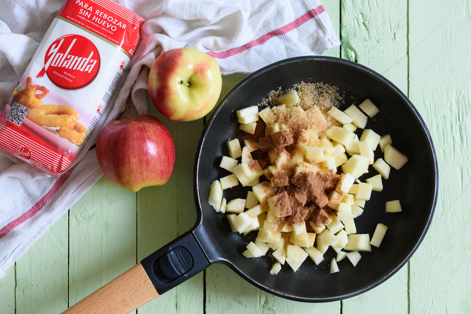 En una sartén cocinamos la manzana con el azúcar moreno, la canela y el zumo de limón hasta que la manzana esté tierna.