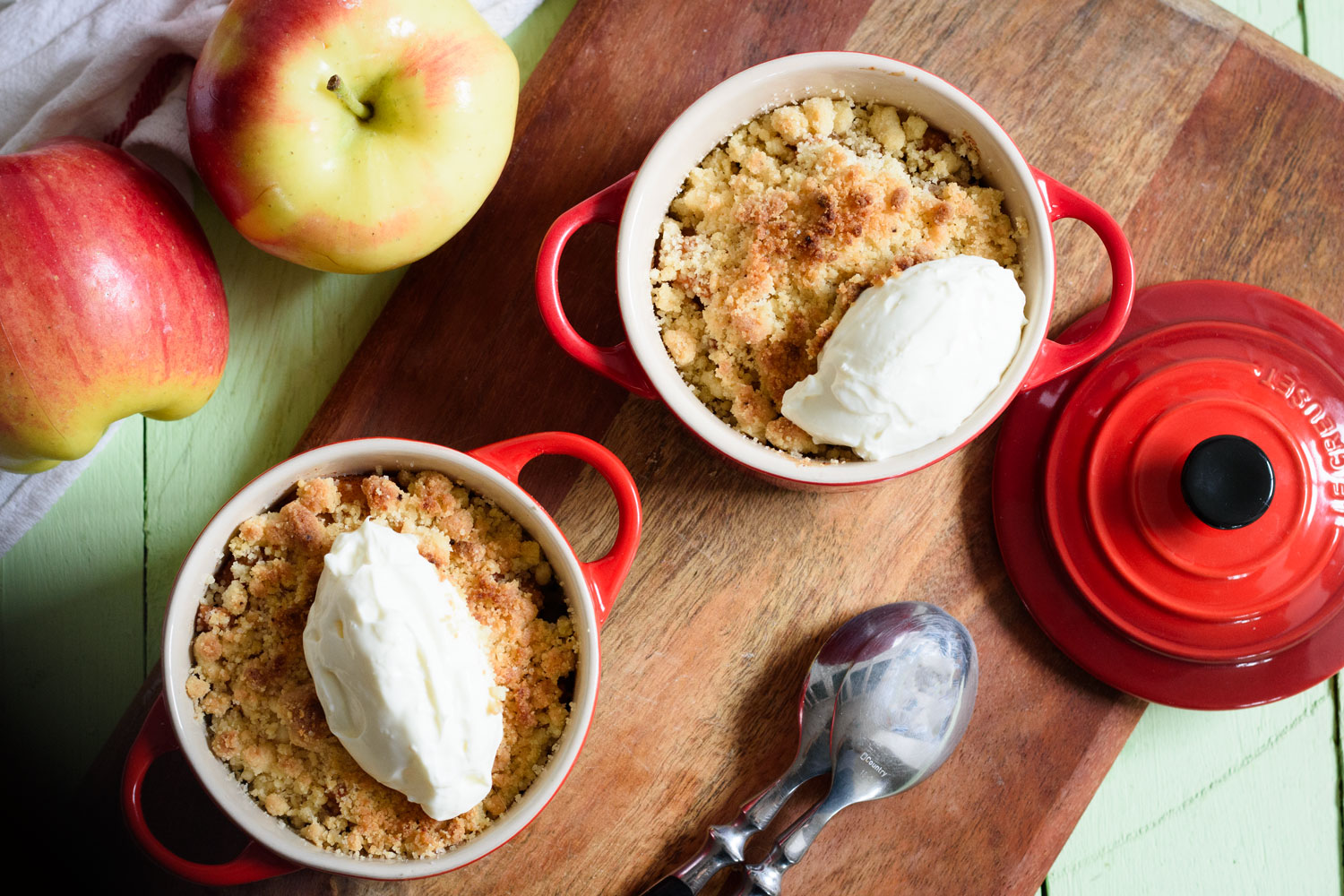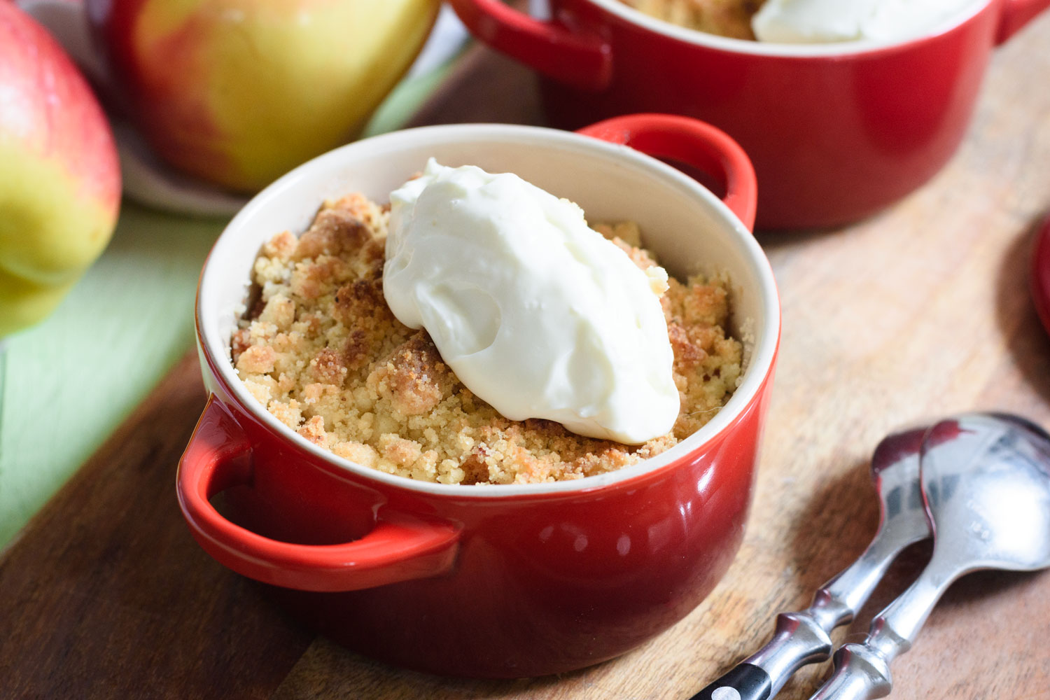 Si tienes antojo de algo dulce y rico. Aquí tienes una receta fácil y deliciosa en estas cazuelitas de crumble de manzana. Crujientes por fuera y jugosas por fuera.