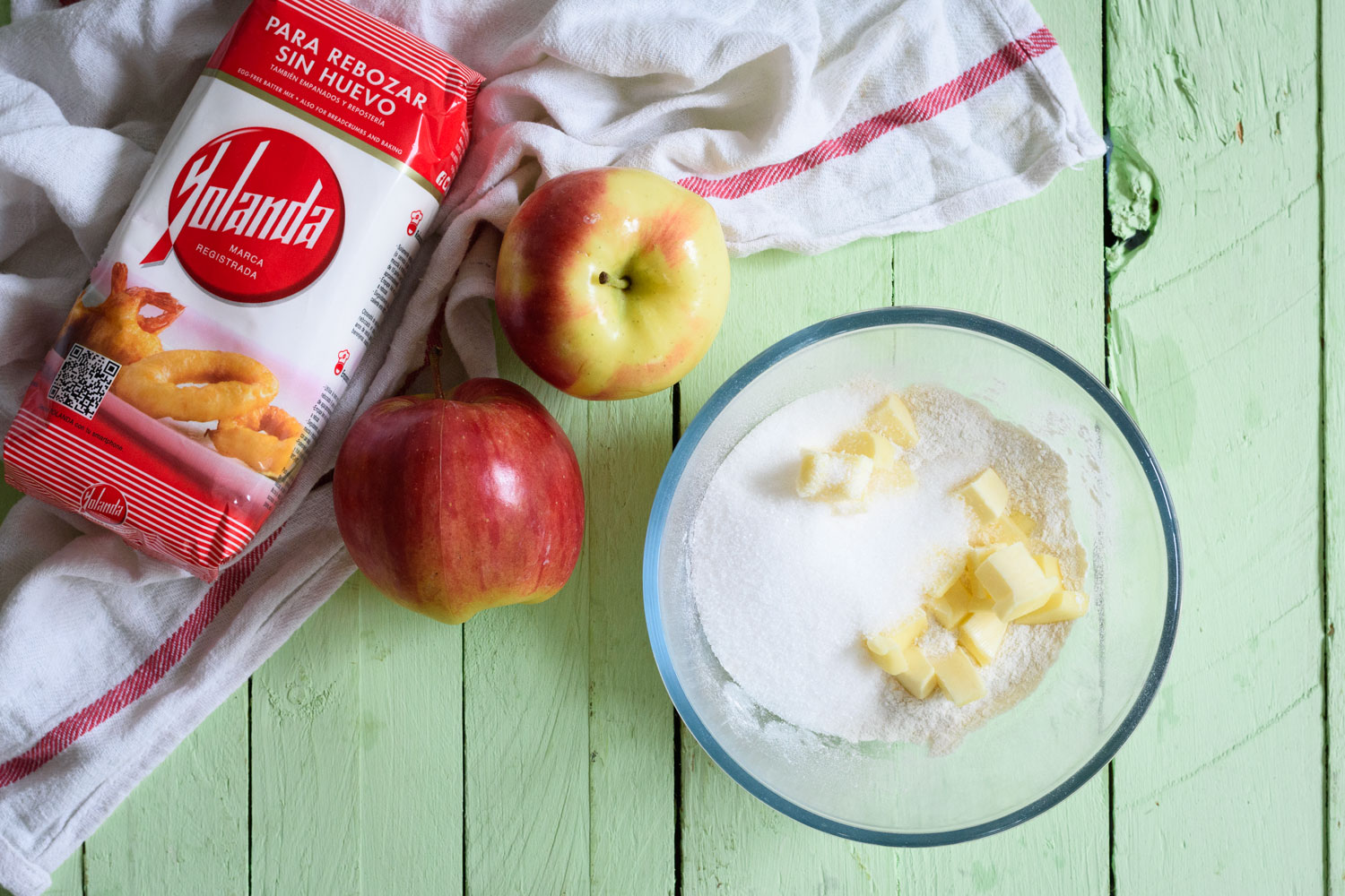 En un cuenco mezclamos la Harina Yolanda con el azúcar blanco y la mantequilla hasta obtener una textura arenosa.