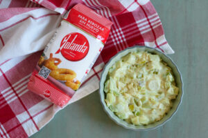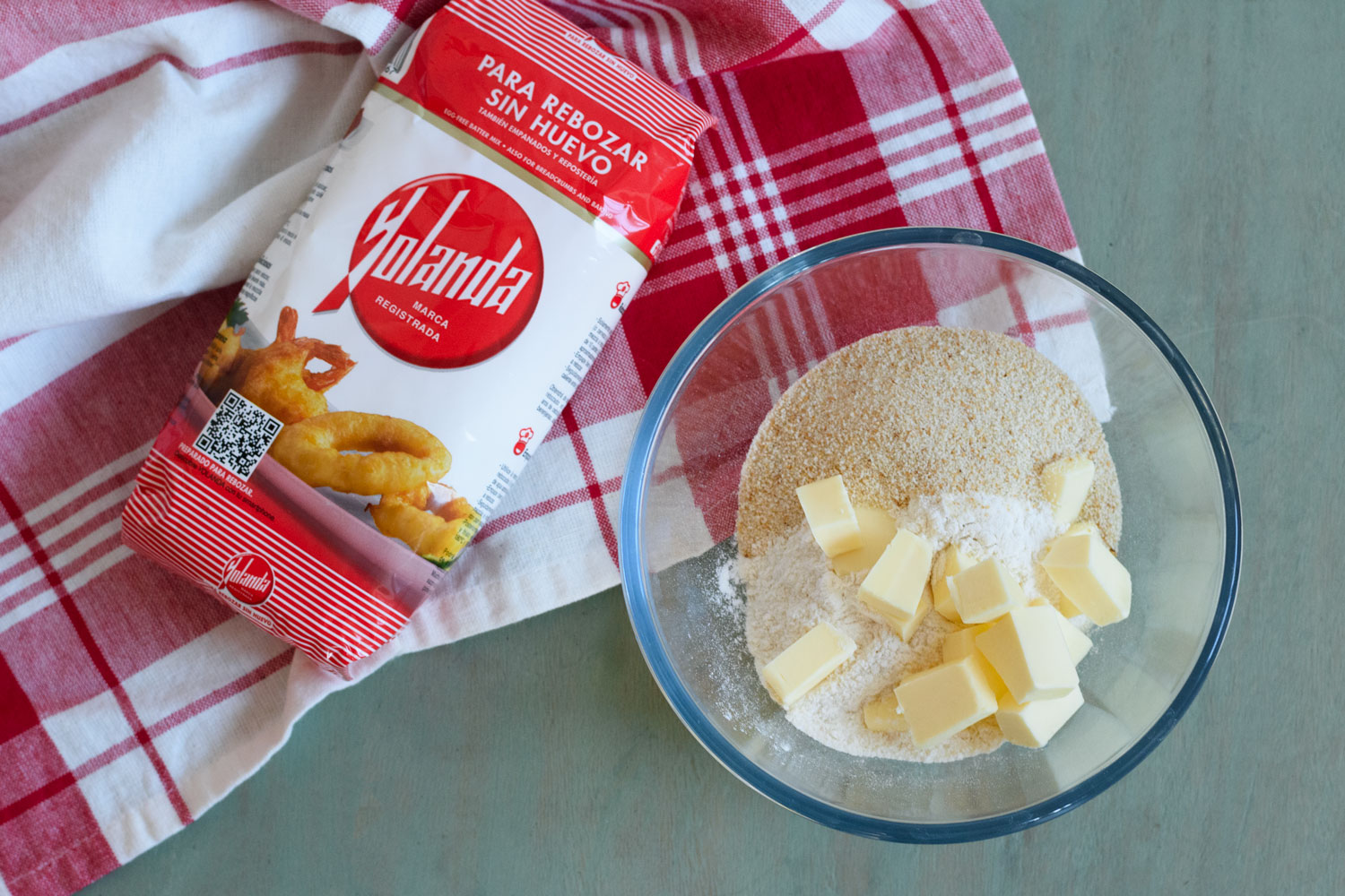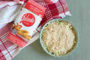- En un bol mezclamos la Harina Yolanda con la mantequilla cortada en dados y el queso en polvo hasta obtener una textura arenosa.