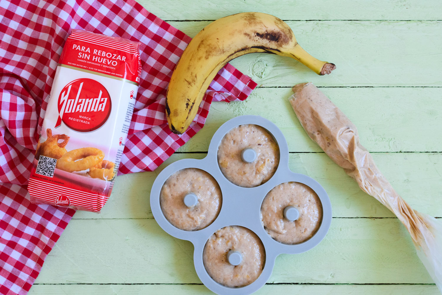 - Pasamos a una manga pastelera y rellenamos los moldes de donuts.