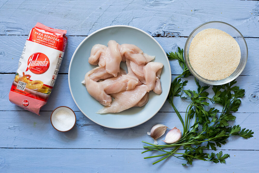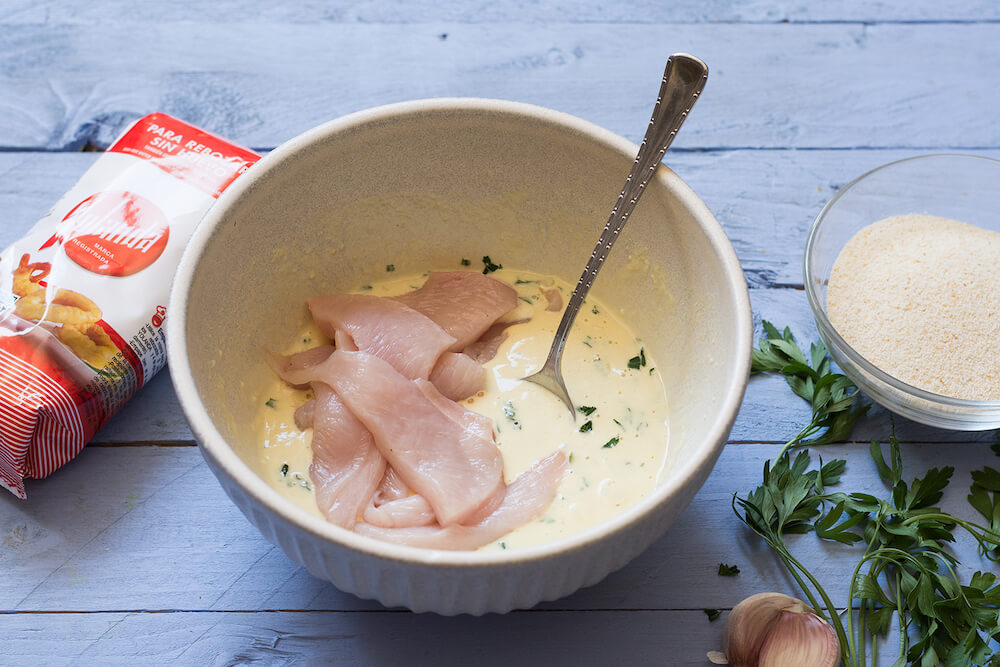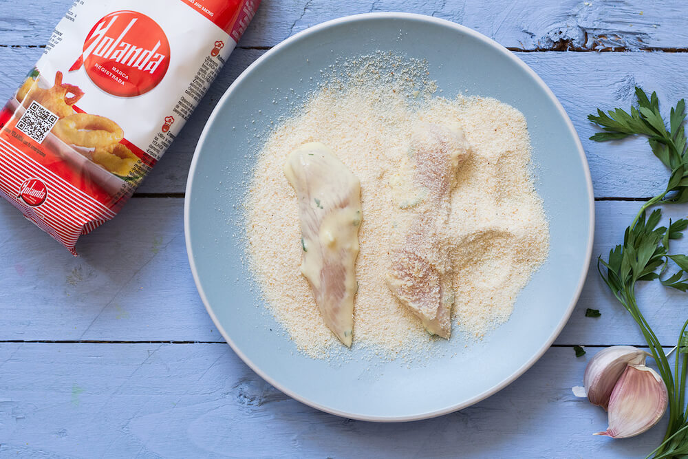 - 3. Ponemos aceite en una sartén o freidora a calentar. Mientras, vamos pasando los trozos de pechuga por pan rallado.