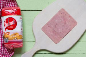 - Extendemos 2 lonchas de jamón de York de manera que se solapen una sobre otra. En un extremo colocamos una loncha de queso y enrollamos.