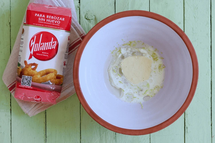 En un cuenco grande añadimos 5 cucharadas de azúcar, 4 cucharadas de aceite de girasol, 3 cucharadas de leche, la ralladura de limón y dos cucharadas de su zumo. Añadimos la yema de Yolanda y batimos bien.