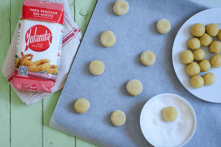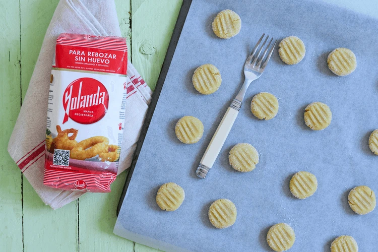 Las depositamos separadas entre sí sobre una hoja de papel vegetal en una bandeja de horno y les vamos dando forma presionando con un tenedor.