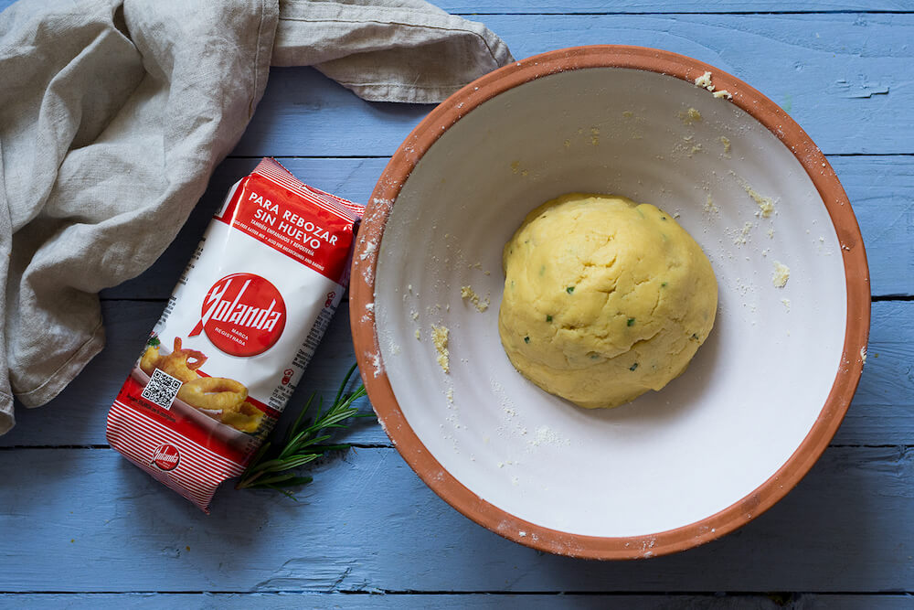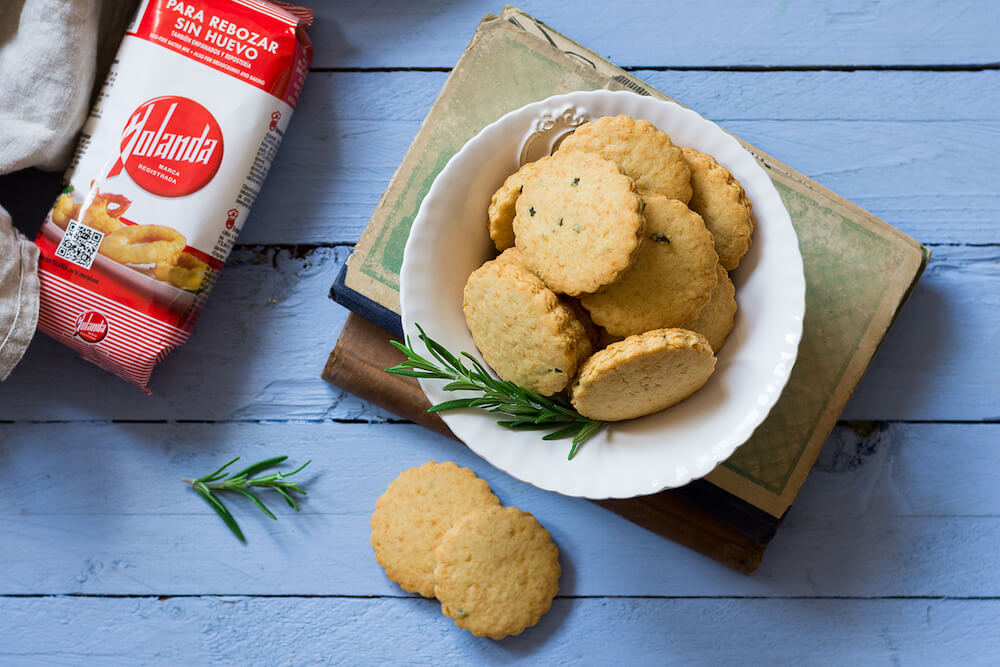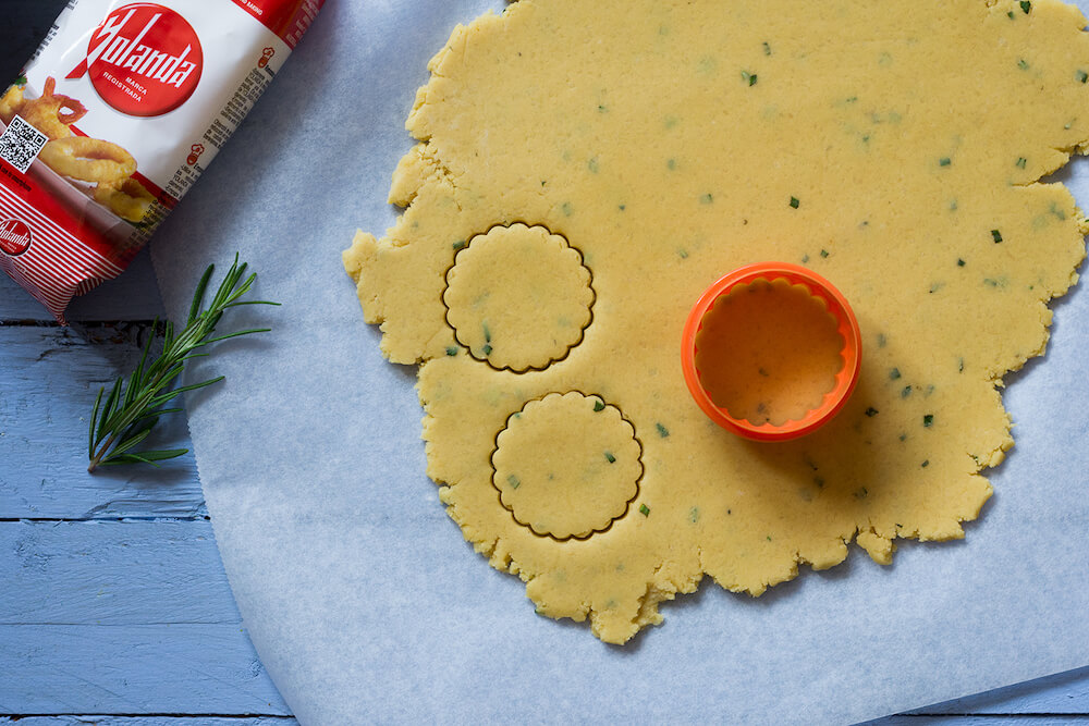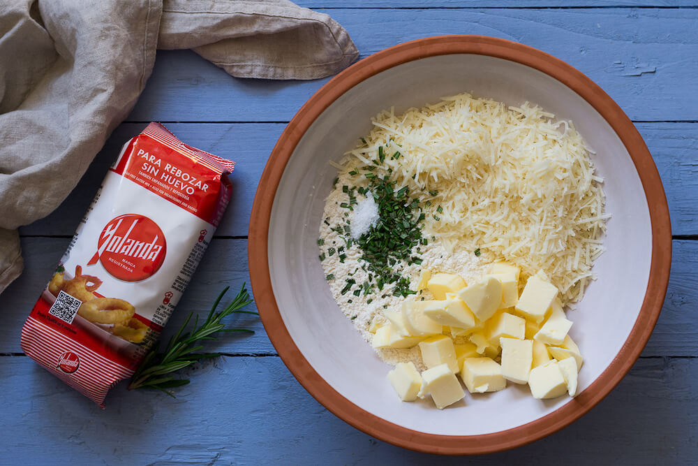 - 1. En un cuenco grande mezclamos bien la Harina Yolanda con el queso parmesano rallado, el romero picado muy fino, la mantequilla a temperatura ambiente y la sal. Mezclamos y añadimos el aceite y el agua.