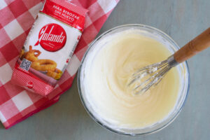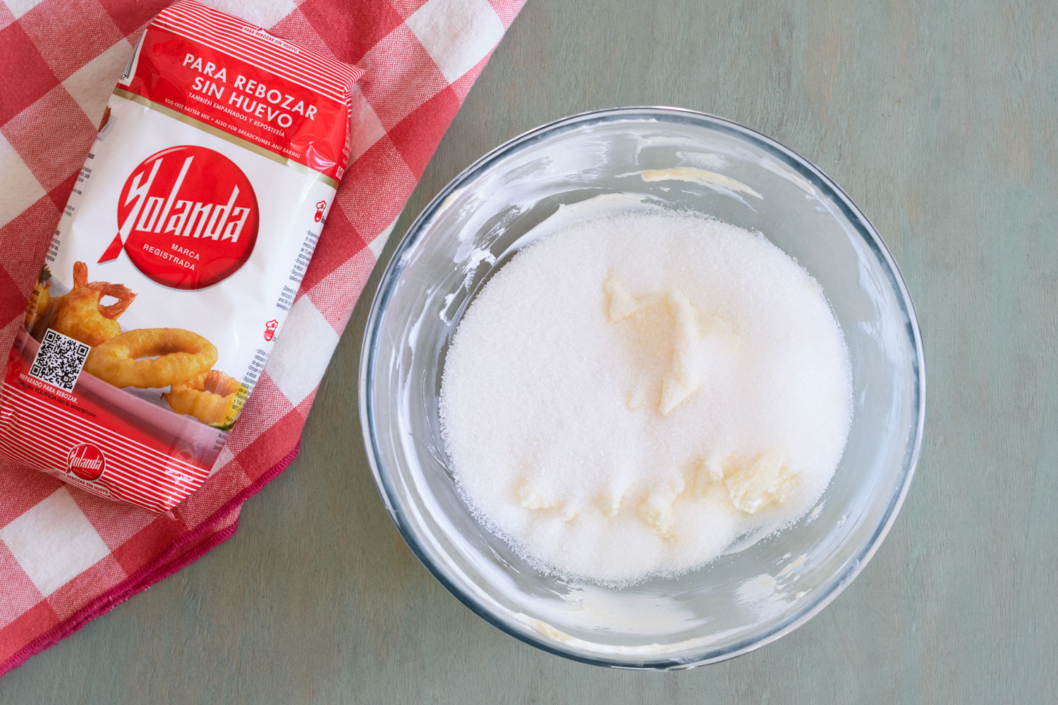 Añadimos el azúcar y seguimos batiendo hasta integrar y tener una textura cremosa.