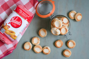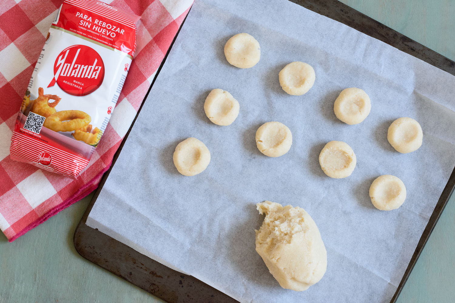 Vamos tomando pequeñas porciones de la masa, dando forma redondeada y las vamos depositando en una bandeja para horno sobre papel vegetal. Las presionamos un poco en el centro con el dedo.