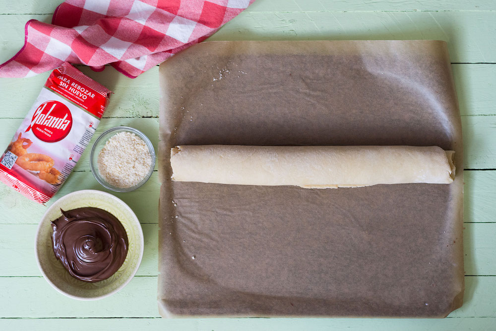 - 5. Enrollamos la masa como si fuera un brazo de gitano y, con cuidado, hacemos un corte a lo largo.