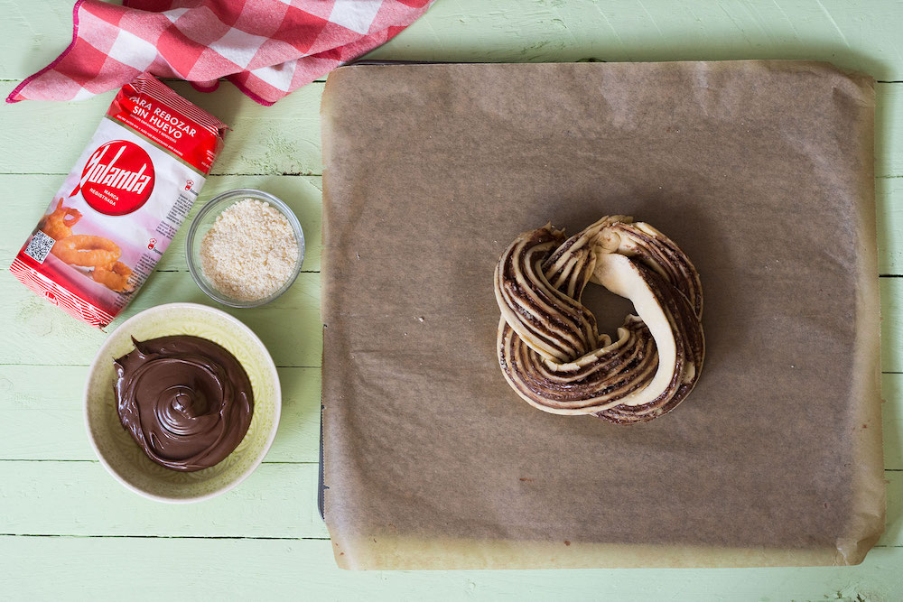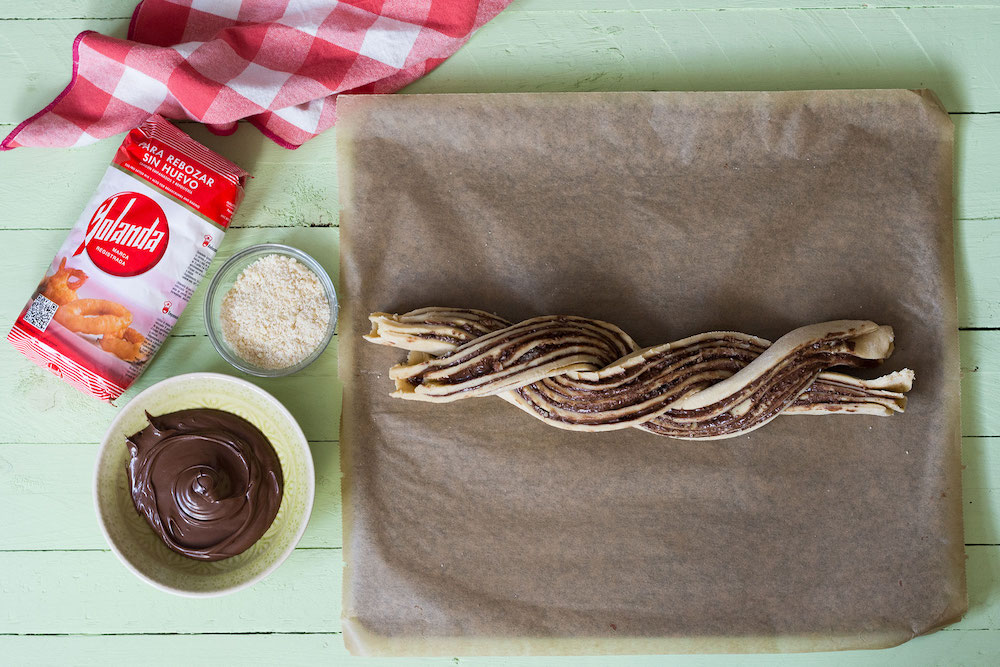 - 6. Giramos hacia arriba los dos trozos de la masa (de manera que veamos las diferentes capas) y con cuidado, hacemos una trenza.