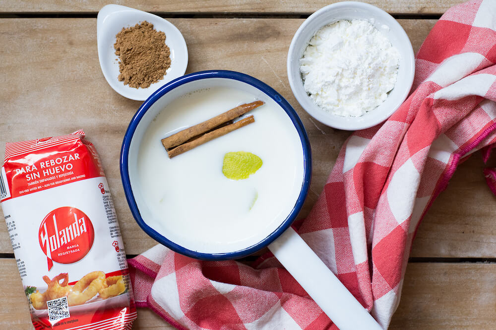 - 1. Ponemos un cazo al fuego con la mitad de la leche, el azúcar, la cascara de limón y el palito de canela. Cuando veamos que va a llegar a ebullición, retiramos del fuego, colamos y dejamos enfriar.