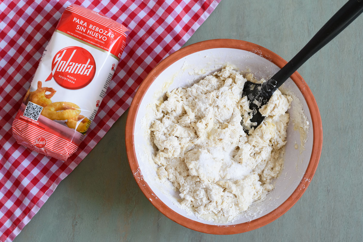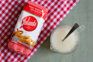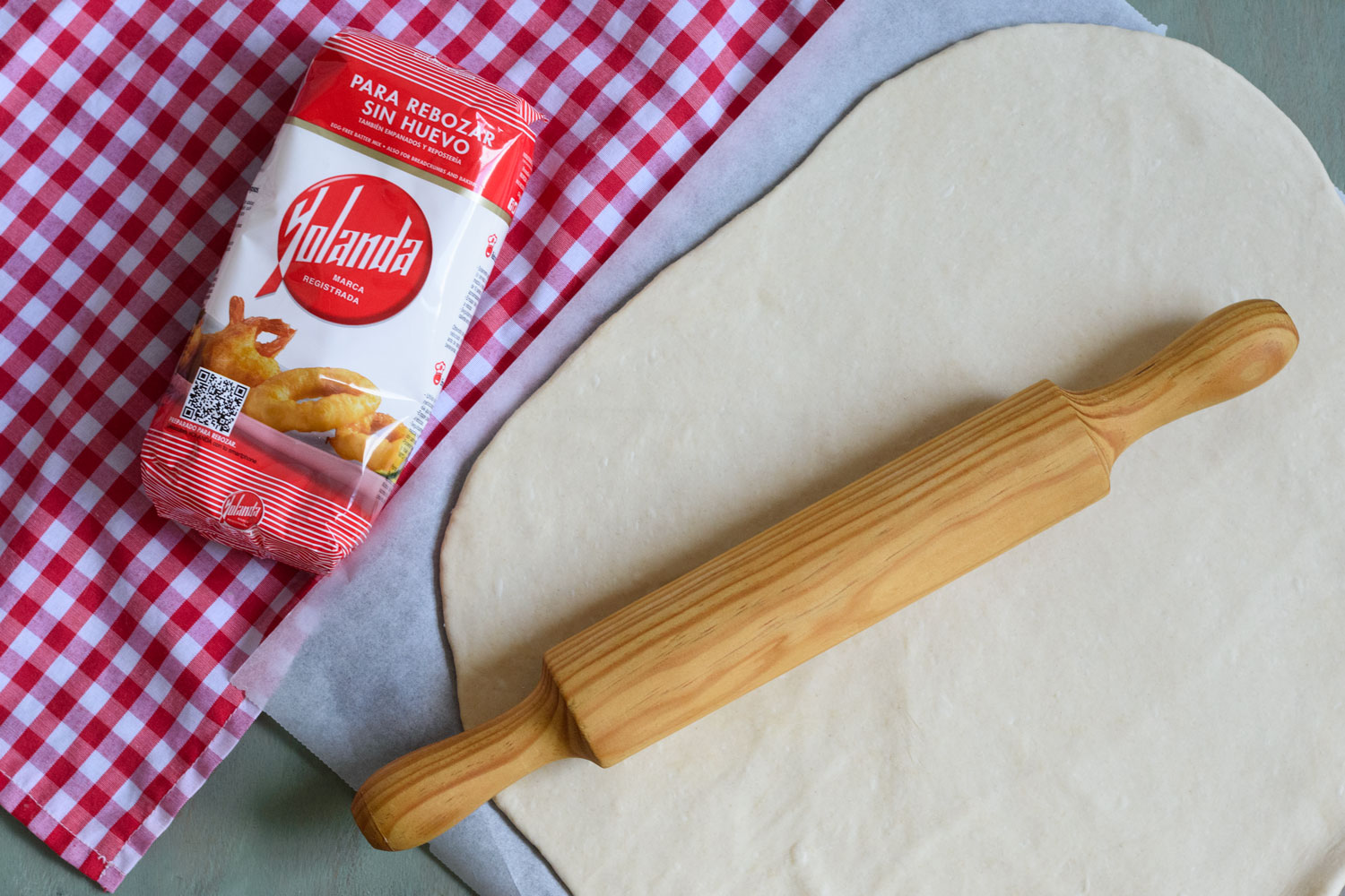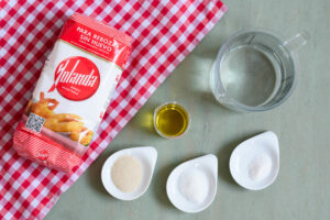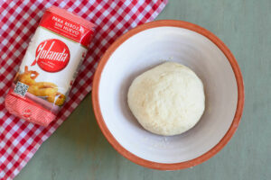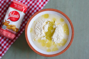 En un cuenco grande mezclamos la Harina Yolanda con la levadura y el aceite. Añadimos la sal y mezclamos y amasamos hasta obtener una bola elástica y homogénea.