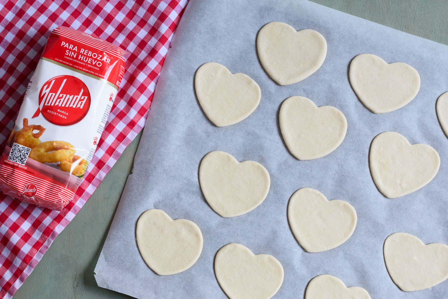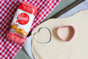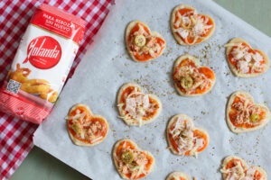 Estiramos con ayuda de un rodillo y con un cortador con forma de corazón vamos cortando las mini pizzas y depositándolas en una bandeja sobre papel vegetal.