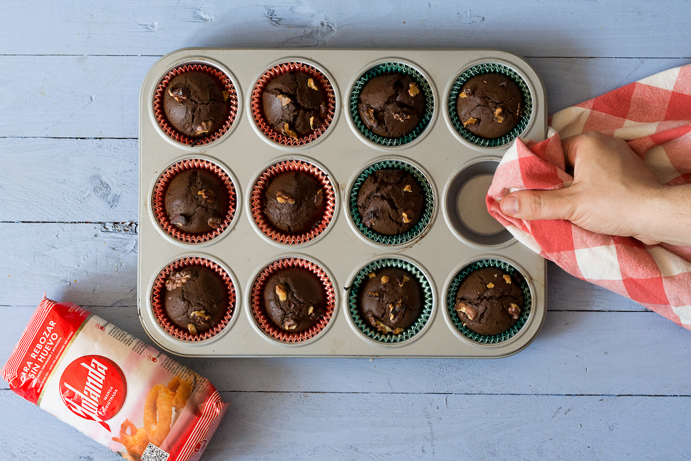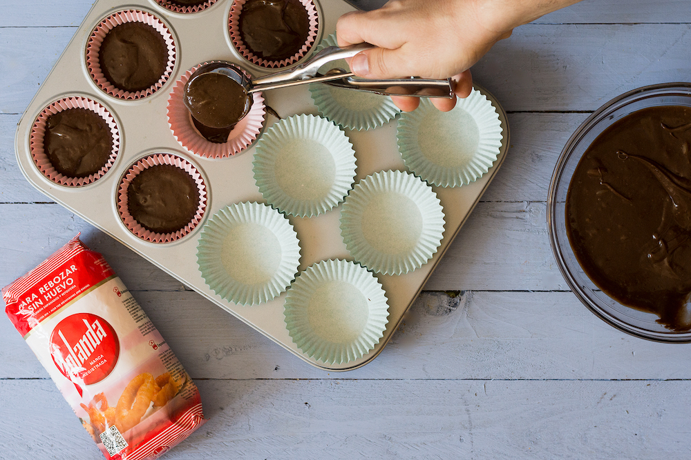 - Tomamos una bandeja para muffis o capsulas de papel de horno y con ayuda de una cuchara de helado, vamos repartiendo la masa en ellas.