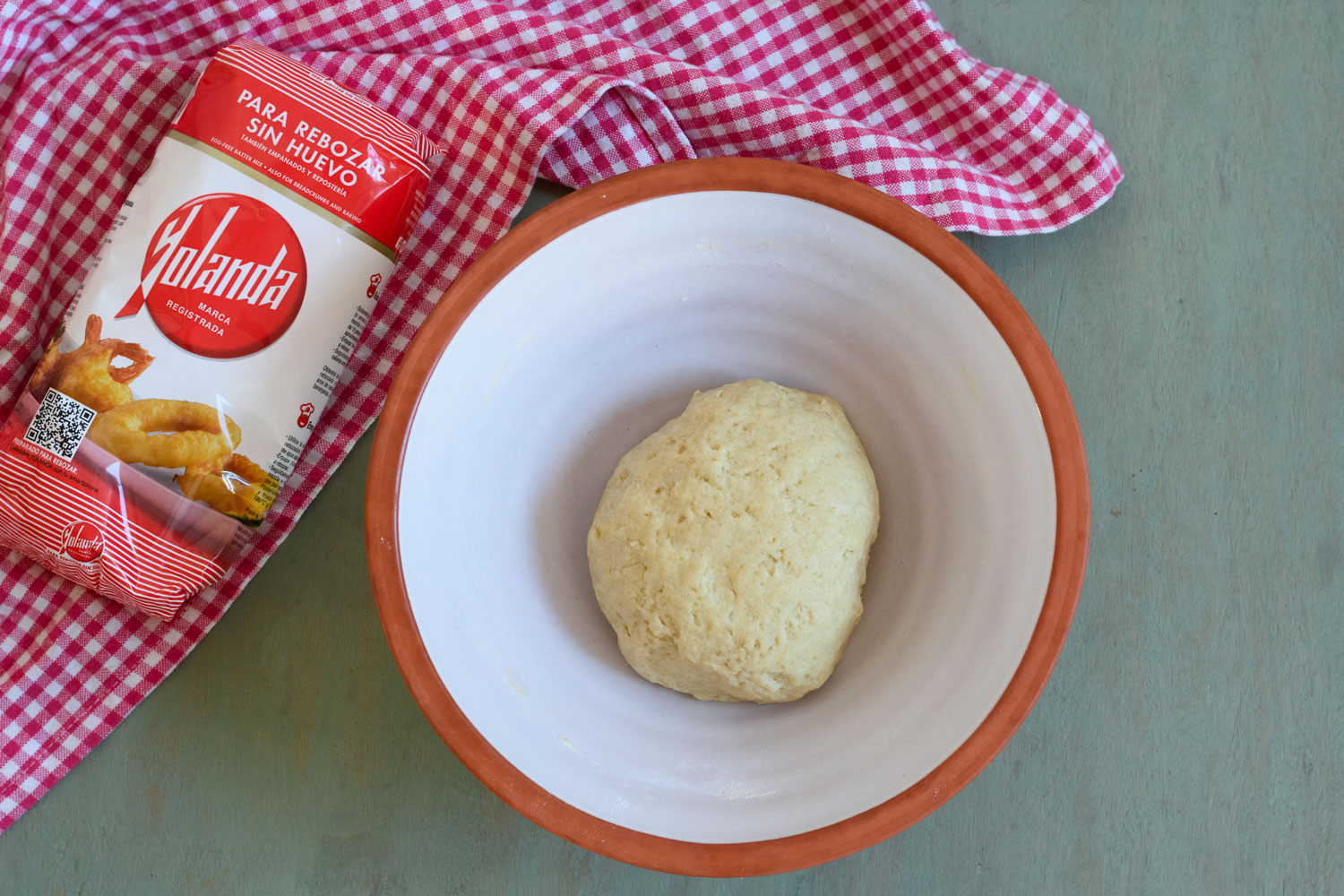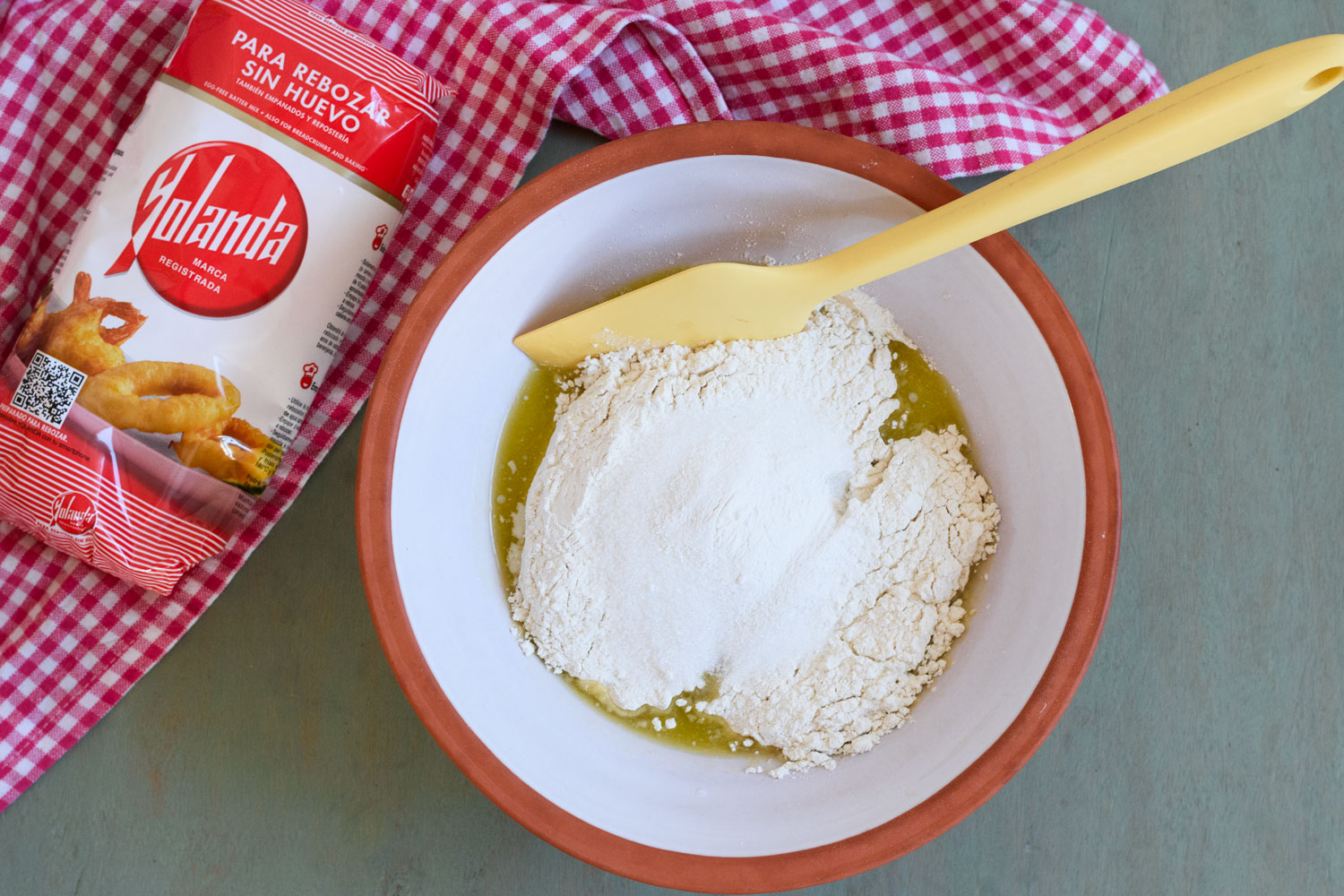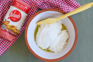 Añadimos los ingredientes secos (harina, azúcar y levadura) mezclamos y amasamos hasta integrar.
