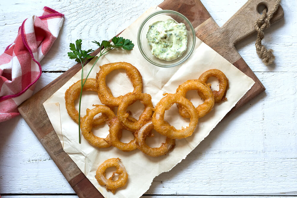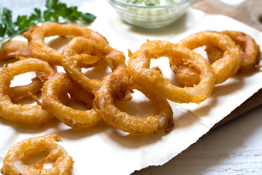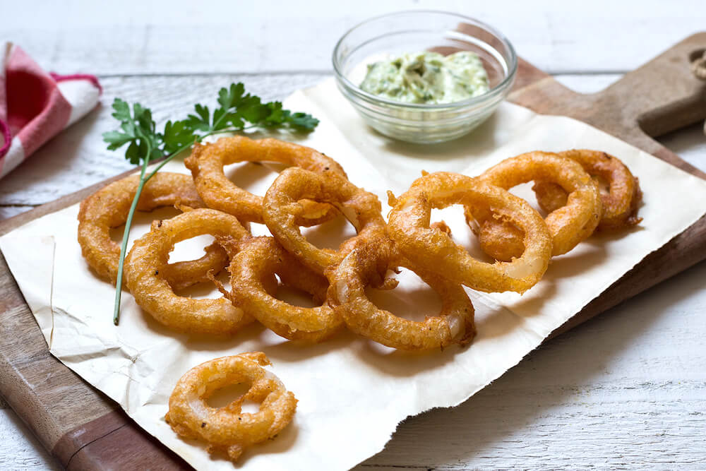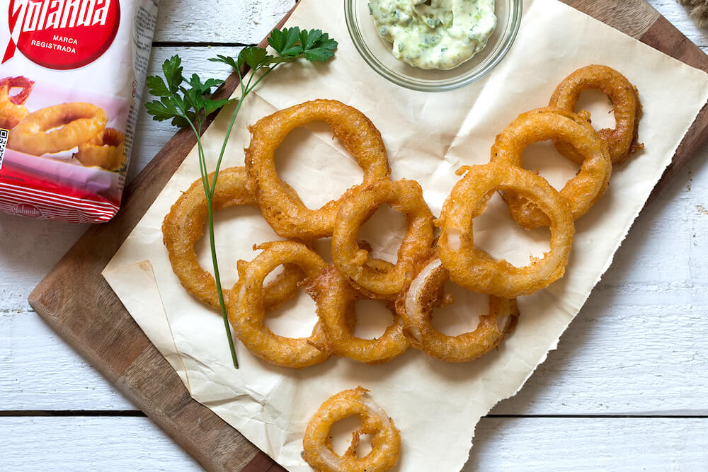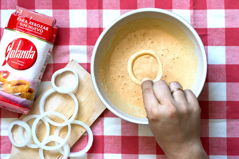 - Ponemos una sartén o freidora a calentar con el aceite vegetal. Cuando empiece a humear, vamos pasando con cuidado los aros de cebolla por la masa y los pasamos a la freidora.