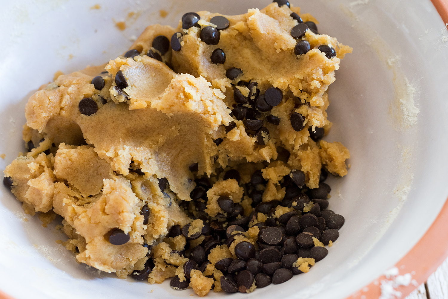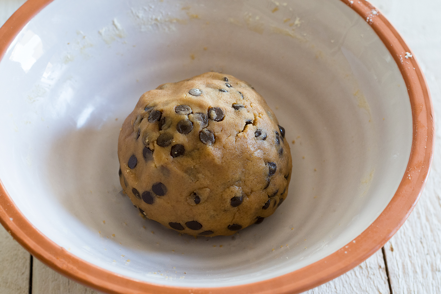 - Añadimos las pepitas de chocolate y seguimos mezclando hasta que estén bien repartidas por toda la masa.