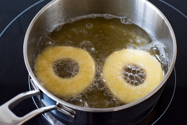 - 7. Calentamos una sartén o freidora con aceite vegetal y las freímos hasta que comiencen a dorarse.