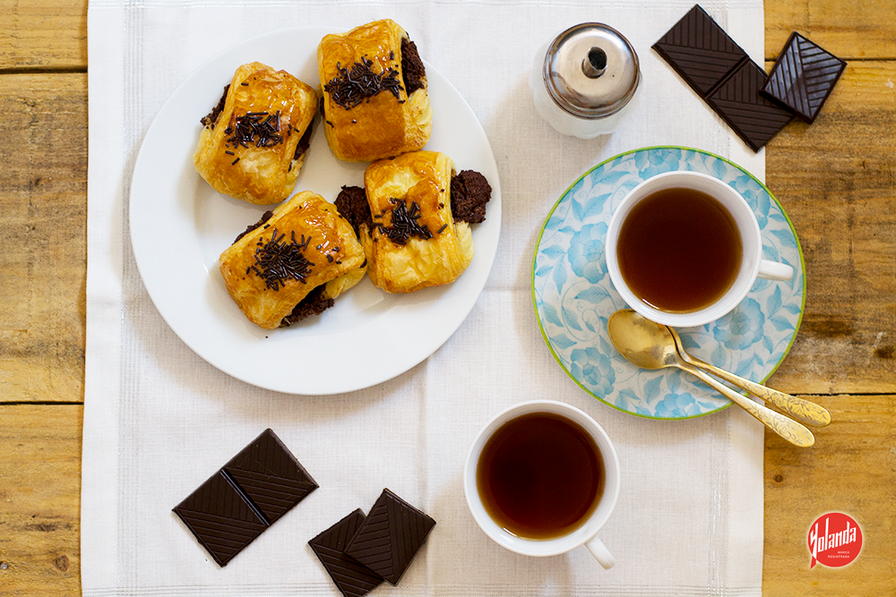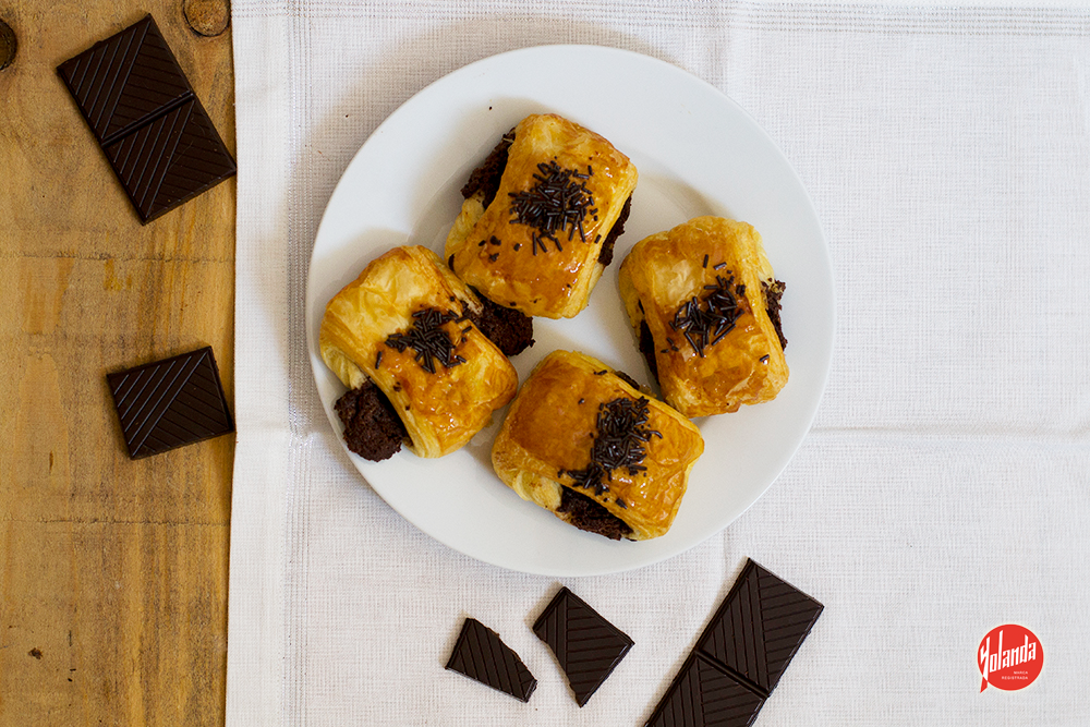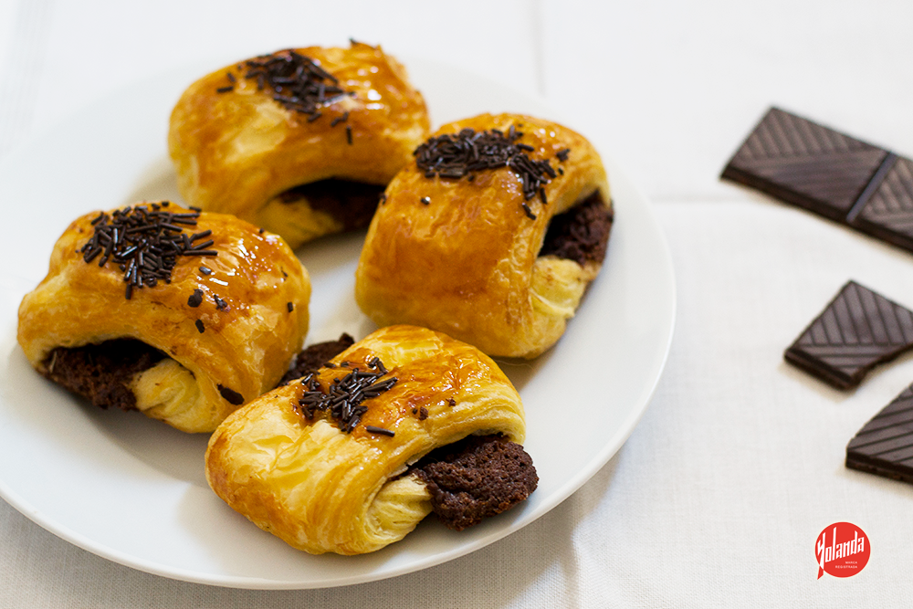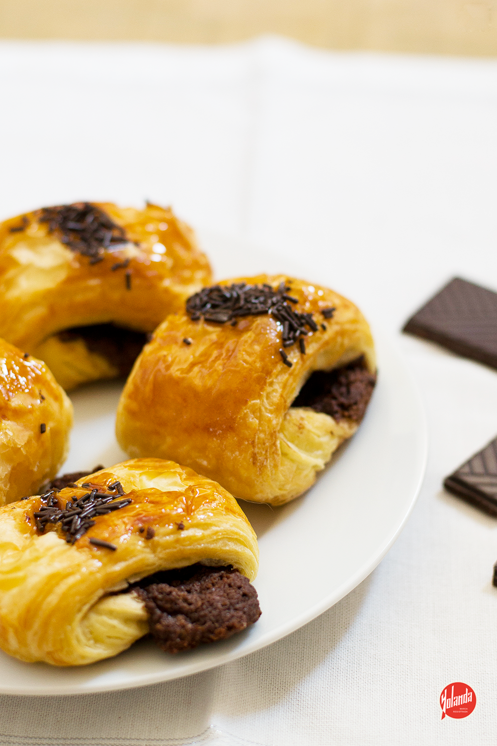- Troceamos el chocolate y colocamos un trozo en el centro de cada rectángulo de masa. Con cuidado, doblamos la masa por envolviendo el trozo de chocolate, de manera que el cierre quede en la parte de abajo.