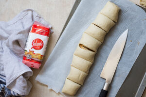 - Enrollamos por el lado más largo y con ayuda de un cuchillo muy afilado vamos cortando nuestros rollitos.