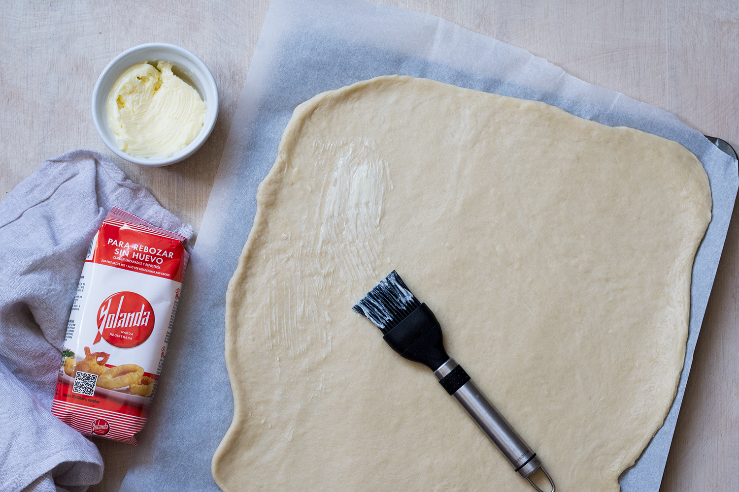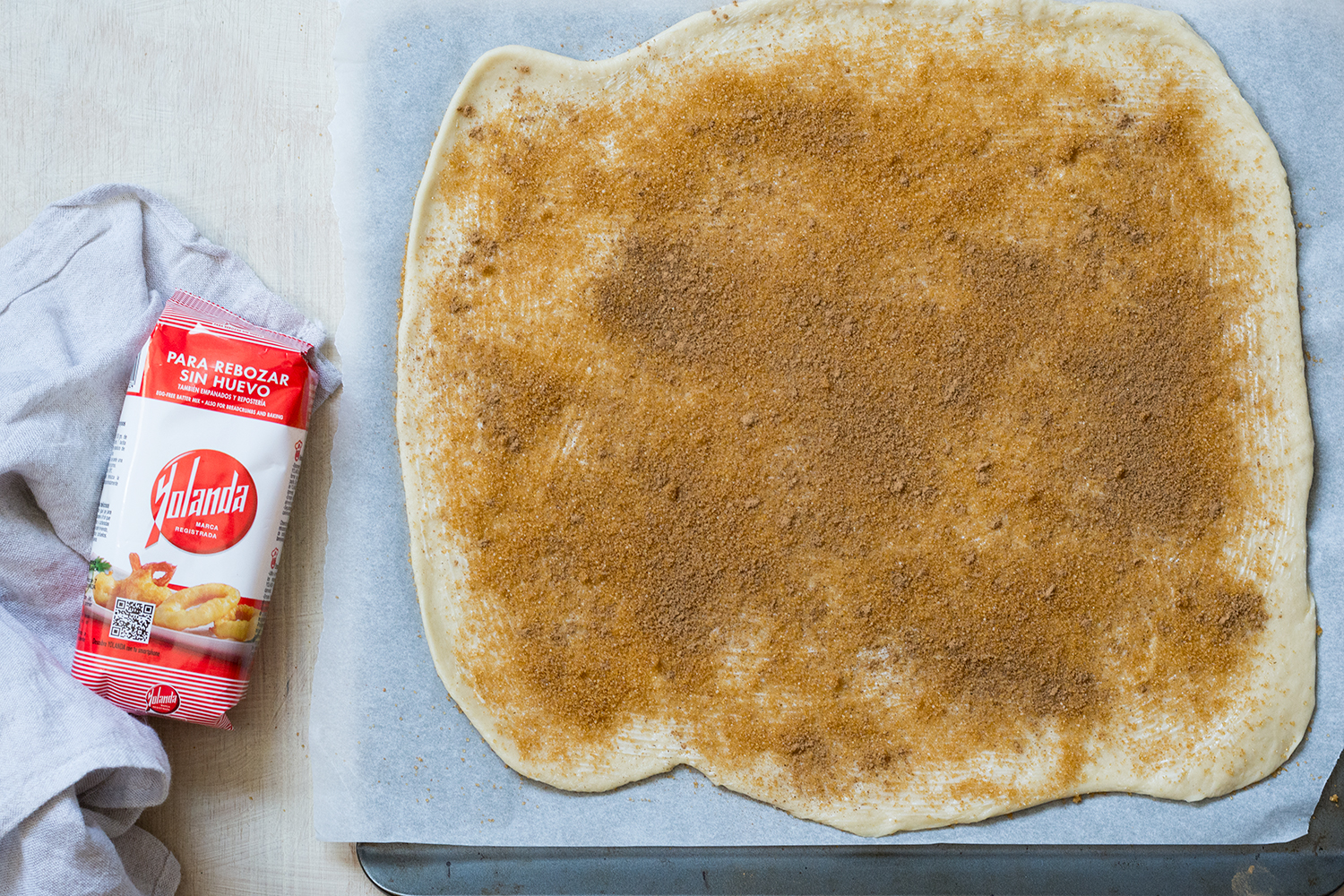 - La pincelamos con mantequilla a temperatura ambiente y espolvoreamos con el azúcar moreno y la canela.