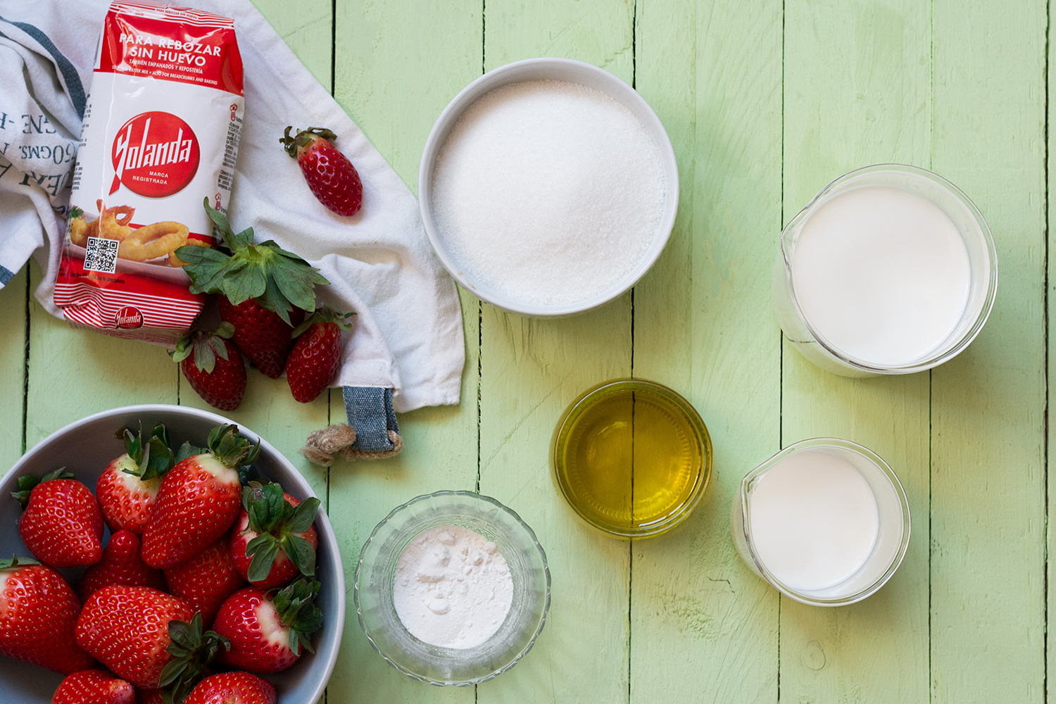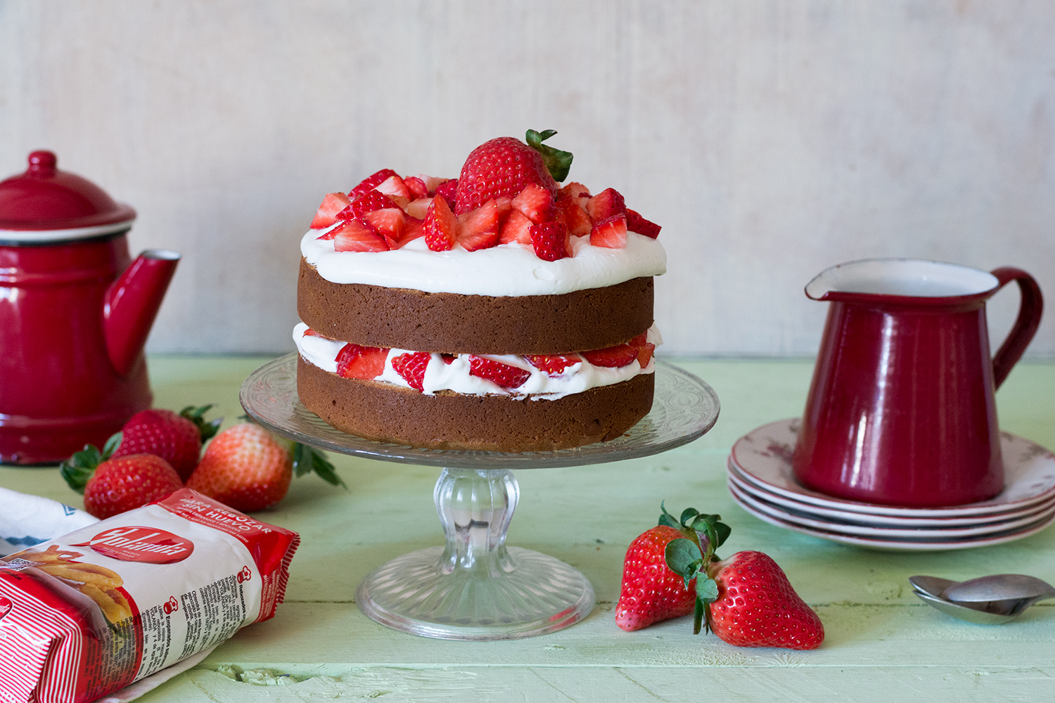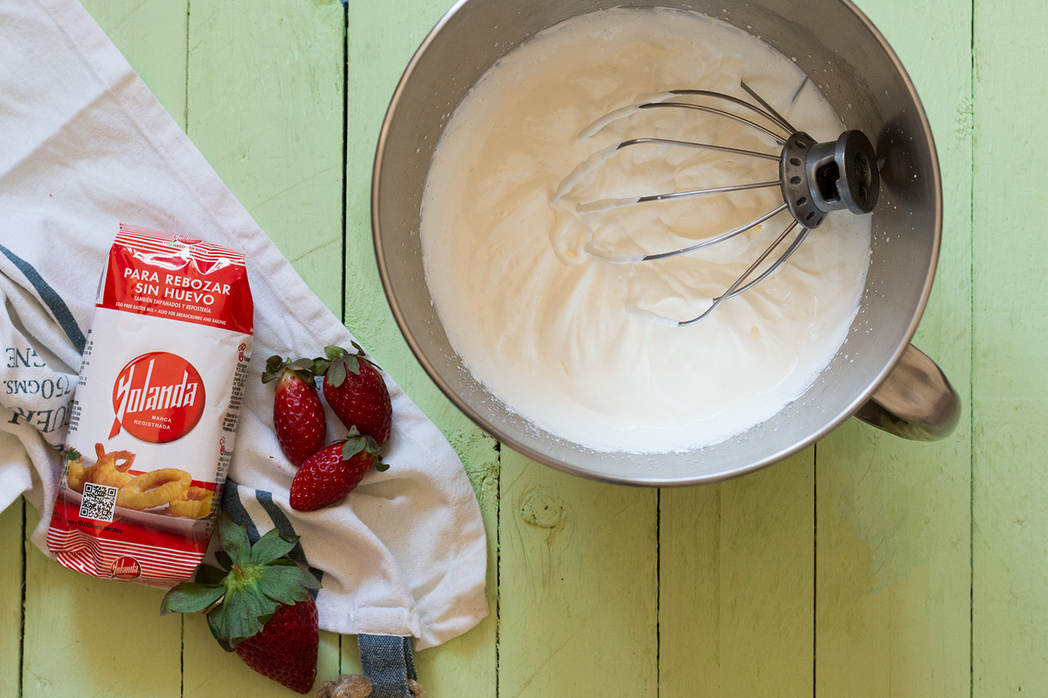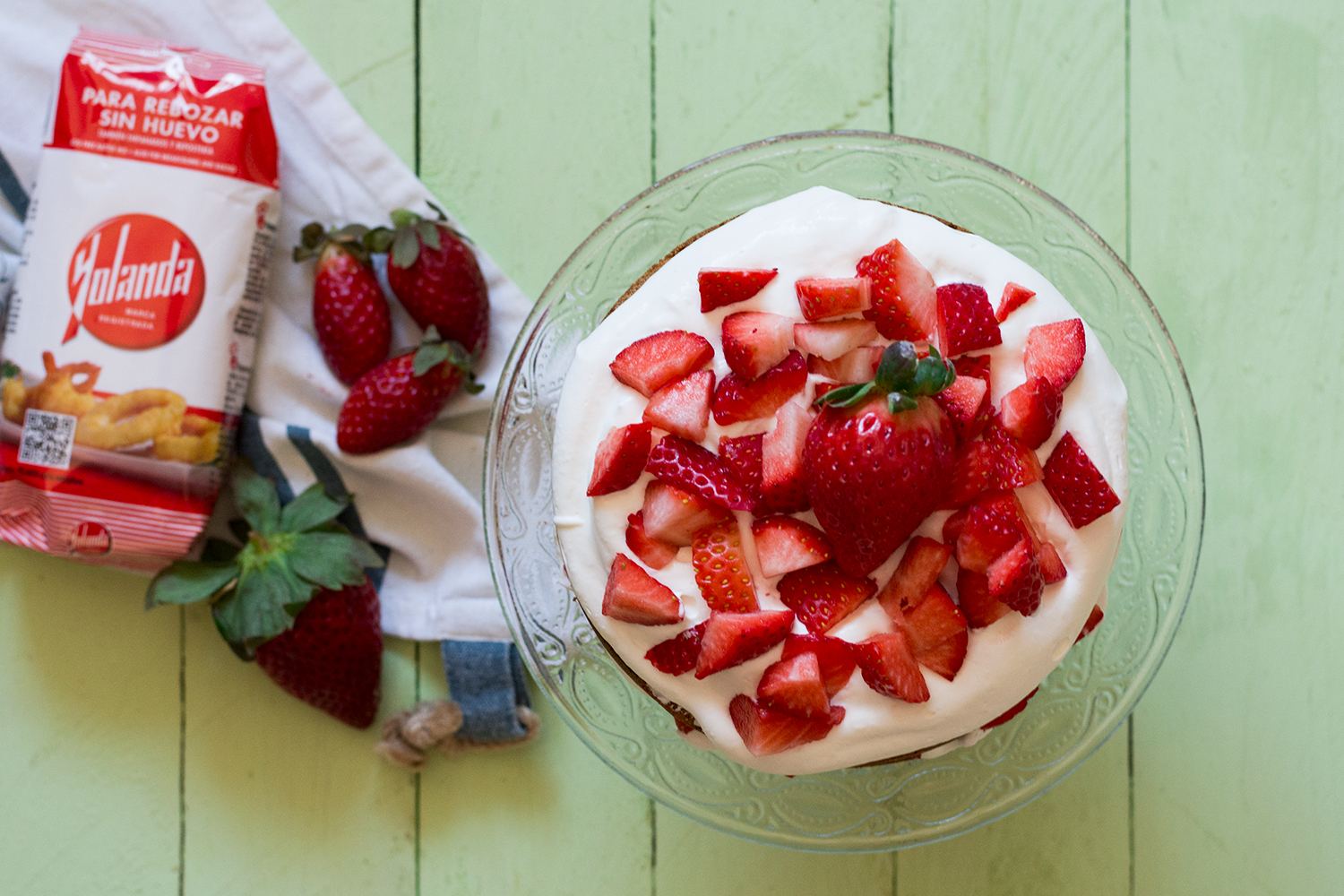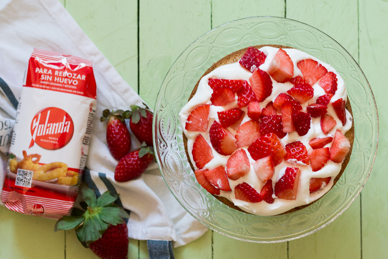 • Cubrimos con la otra parte del bizcocho y repartimos por encima el resto de la nata y fresas.