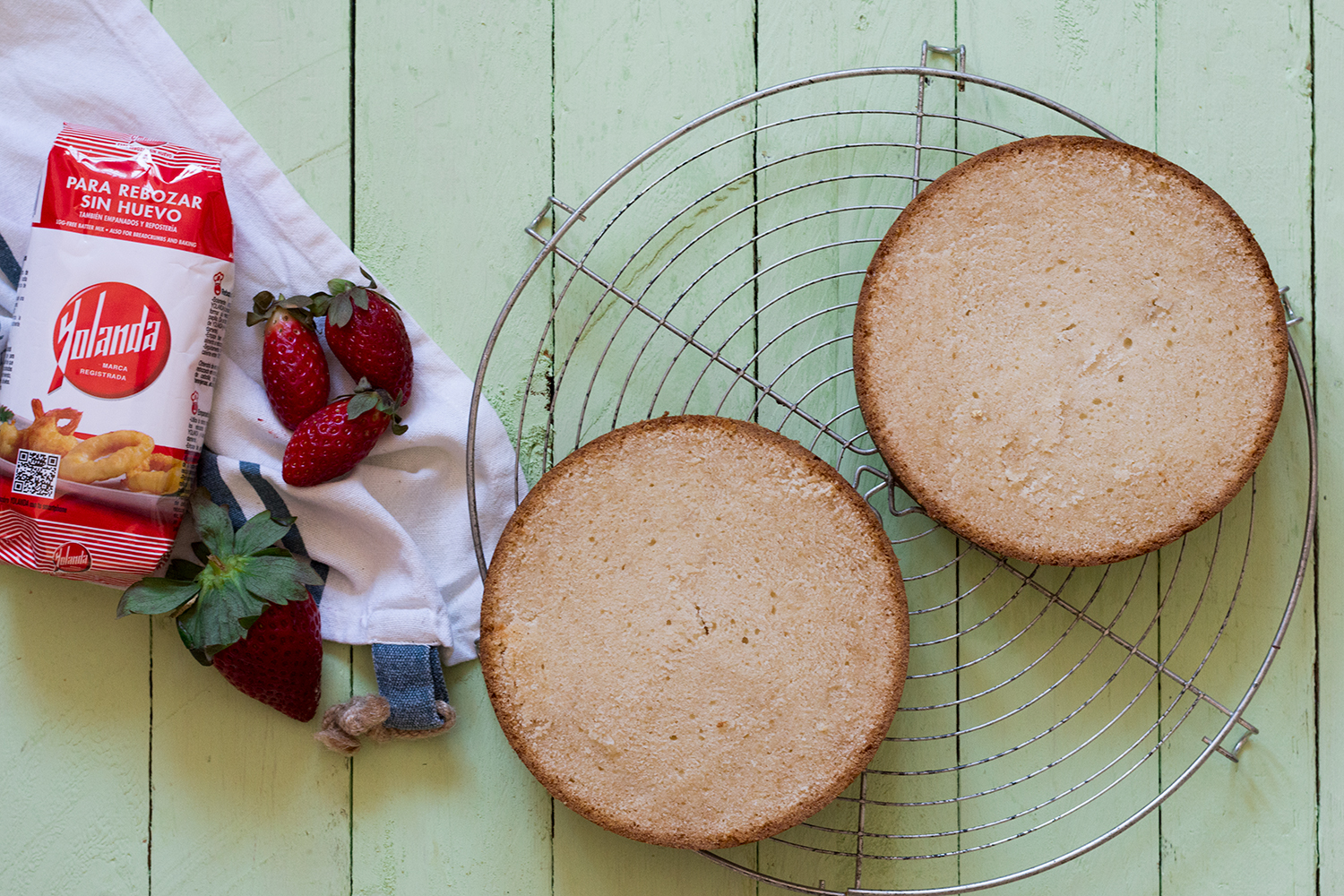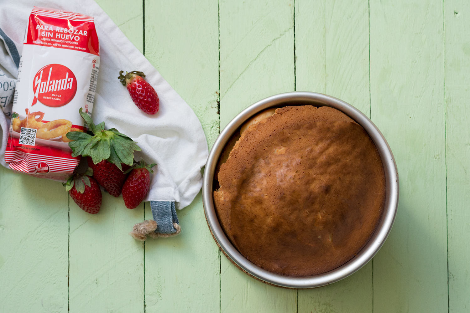 • Con cuidado y ayuda de un cuchillo, rebanamos en dos el bizcocho y desechamos el copete en caso de que el bizcocho lo tenga.