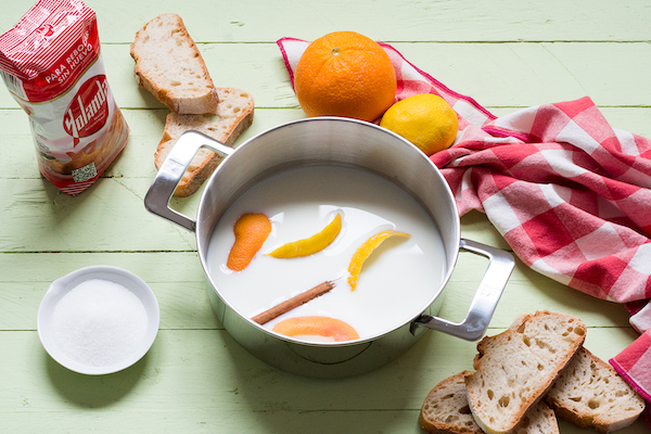 - 1. Ponemos una olla al fuego con 400 ml. de leche, la corteza de limón, de naranja, la ramita de canela y la mitad del azúcar, removemos bien y llevamos a ebullición.