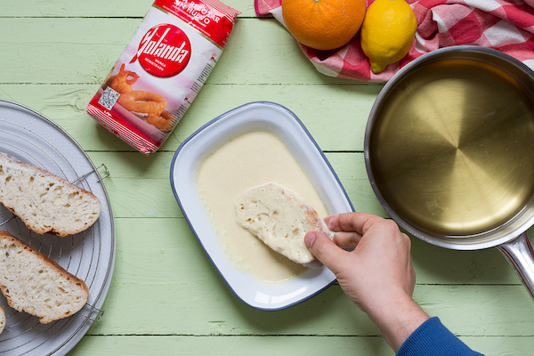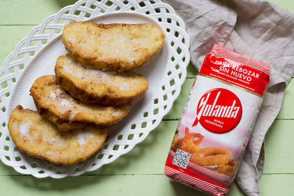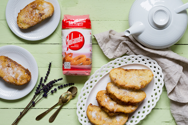 - 5. Ponemos una sartén al fuego con el aceite vegetal. Vamos pasando las rebanadas de pan duro por la mezcla de Harina Yolanda con leche y directamente, con cuidado, las llevamos a la sartén.