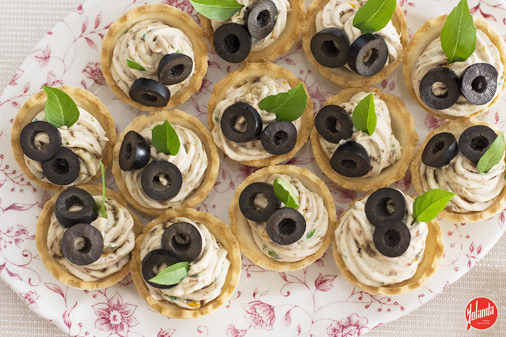 - Con ayuda de una manga pastelera, vamos rellenando las tartaletas. Una vez listas, las decoramos con olivas negras y hojas de albahaca.