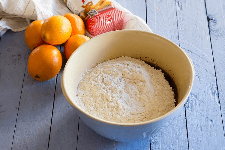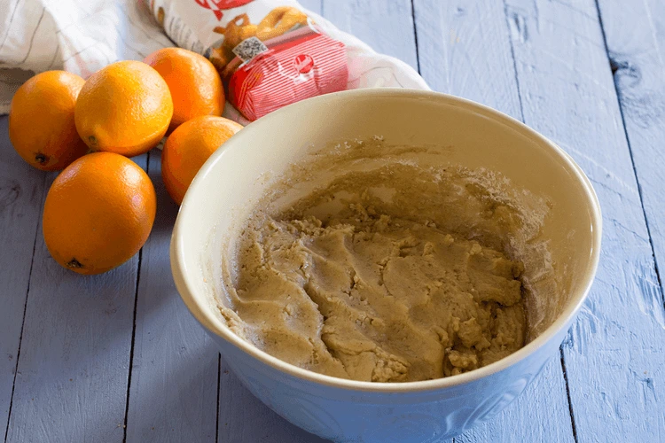 - Añadimos la Harina Yolanda y mezclamos hasta obtener una masa homogénea. Incorporamos la ralladura de naranja y seguimos amasando para que se reparta bien por toda la masa.