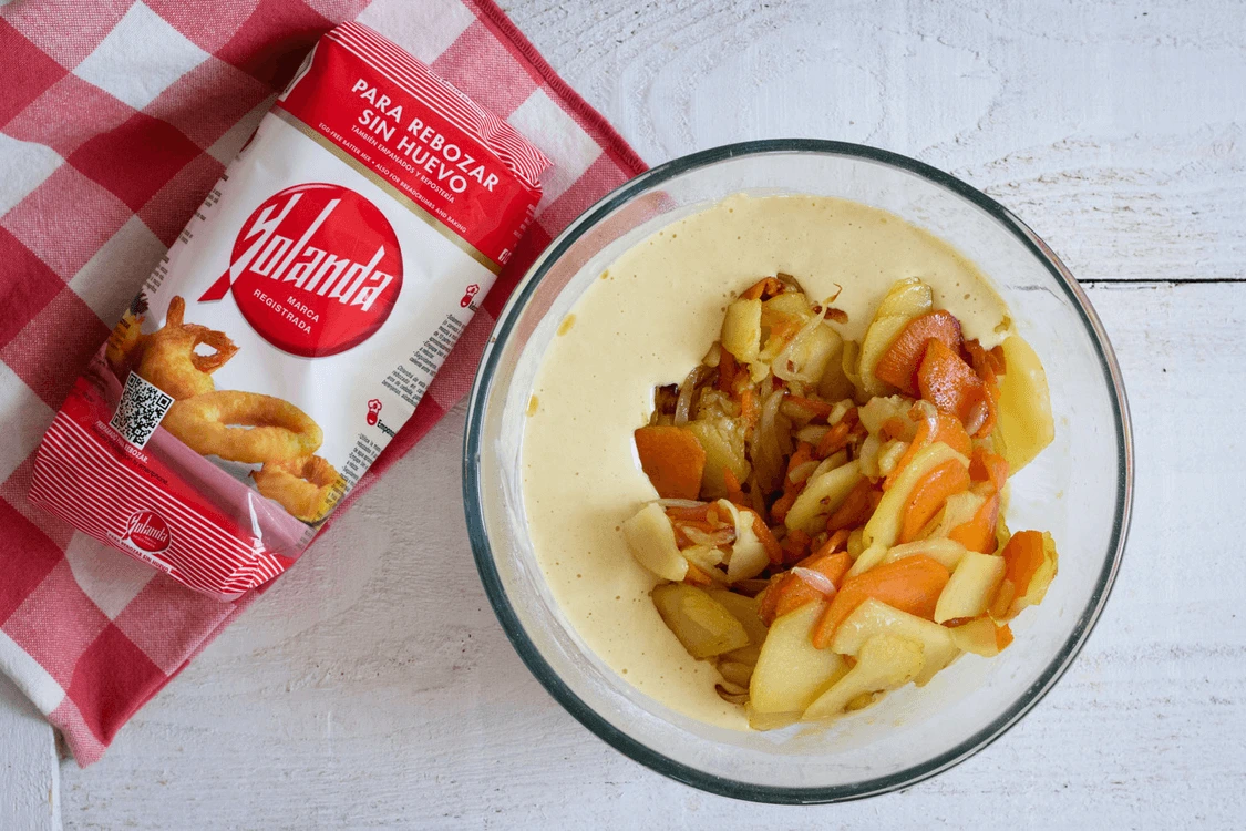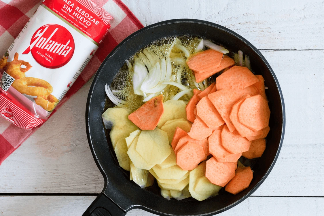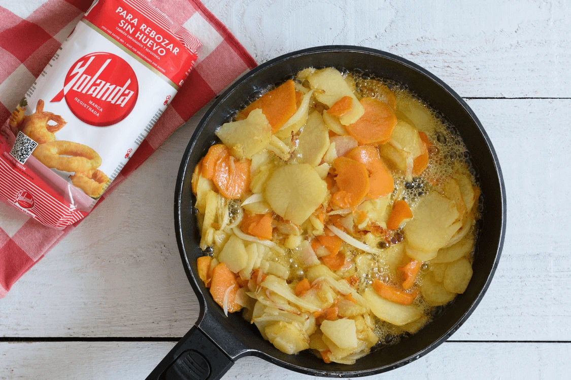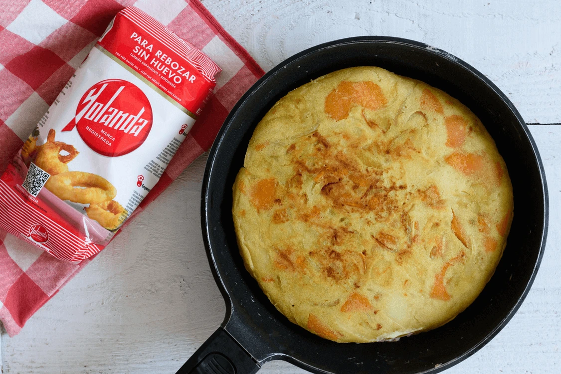 Preparar una tortilla de patatas y boniato sin huevo es posible gracias a harina Yolanda. ¡Manos a la masa!