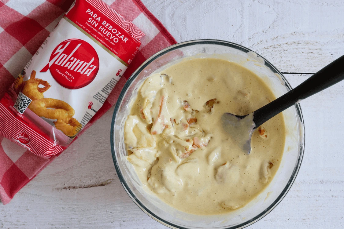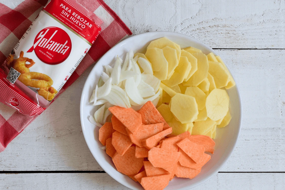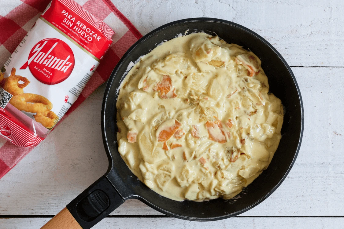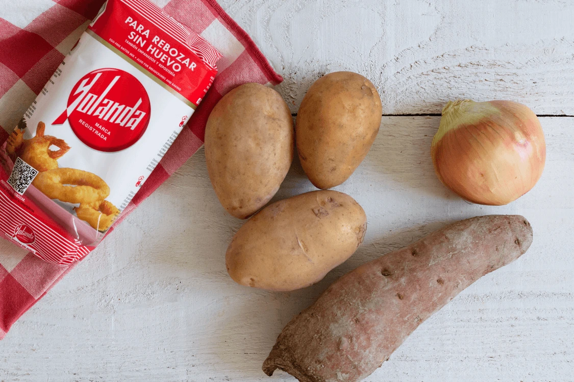 Preparar una tortilla de patatas y boniato sin huevo es posible gracias a harina Yolanda. ¡Manos a la masa!