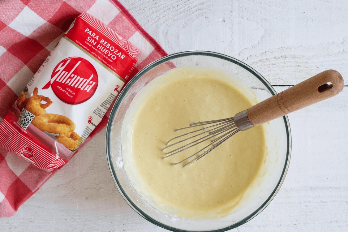En un cuenco mezclamos 200 gr. de Harina Yolanda con 300 ml. de agua hasta obtener una mezcla sin grumos. Añadimos la patata con el boniato, salpimentamos al gusto y mezclamos bien.