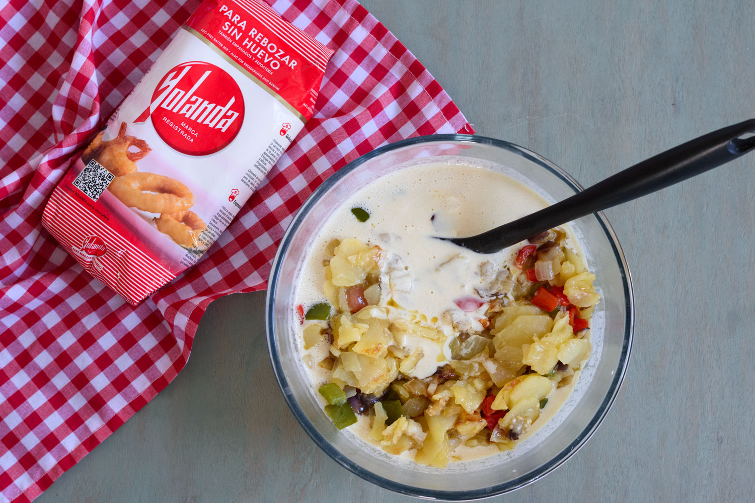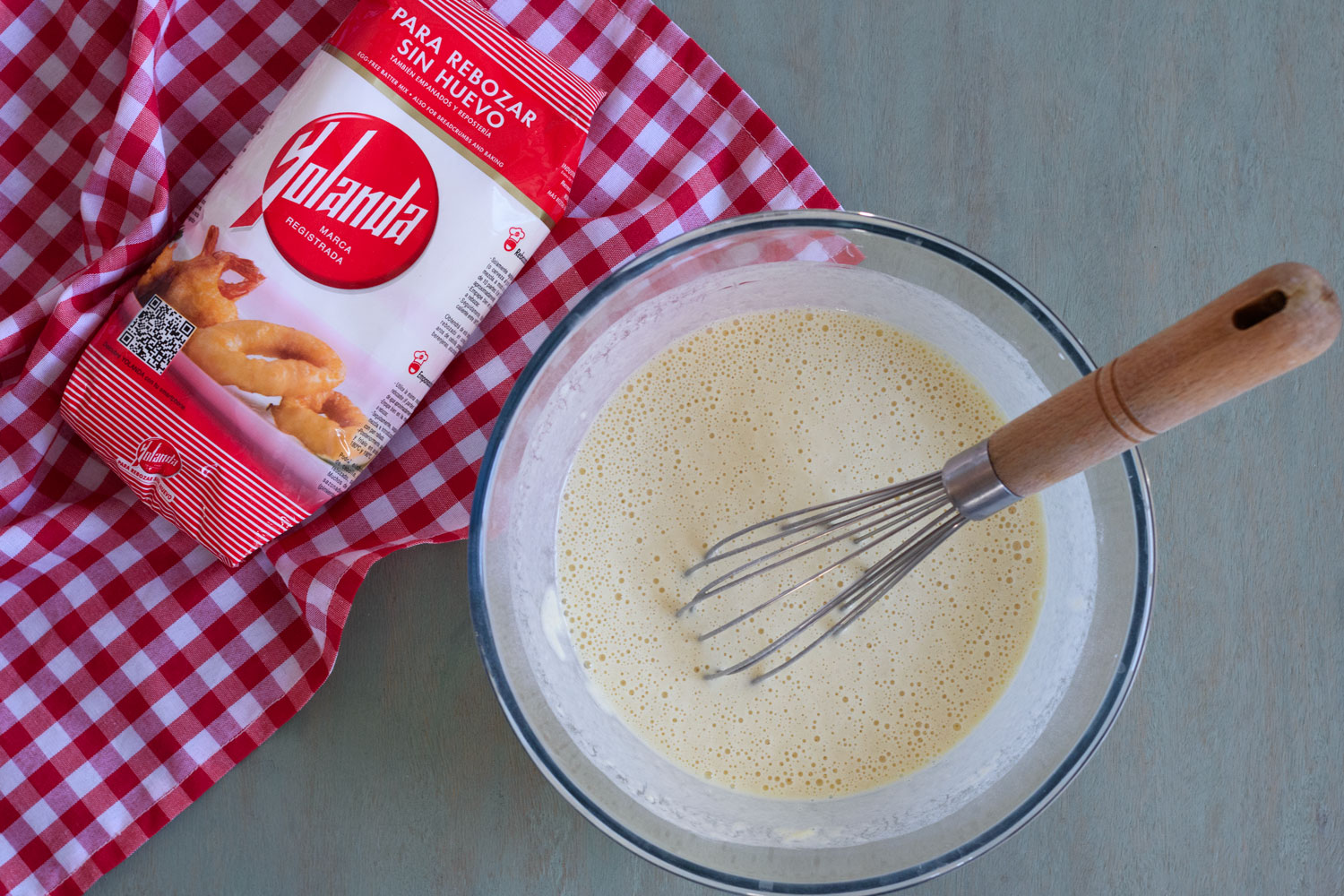 En un cuenco mezclamos 150 gr de Harina Yolanda con 300 ml de agua hasta obtener una mezcla sin grumos.