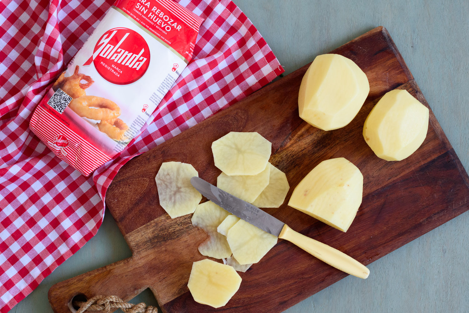 Pelamos y cortamos las patatas en rodajas finas.