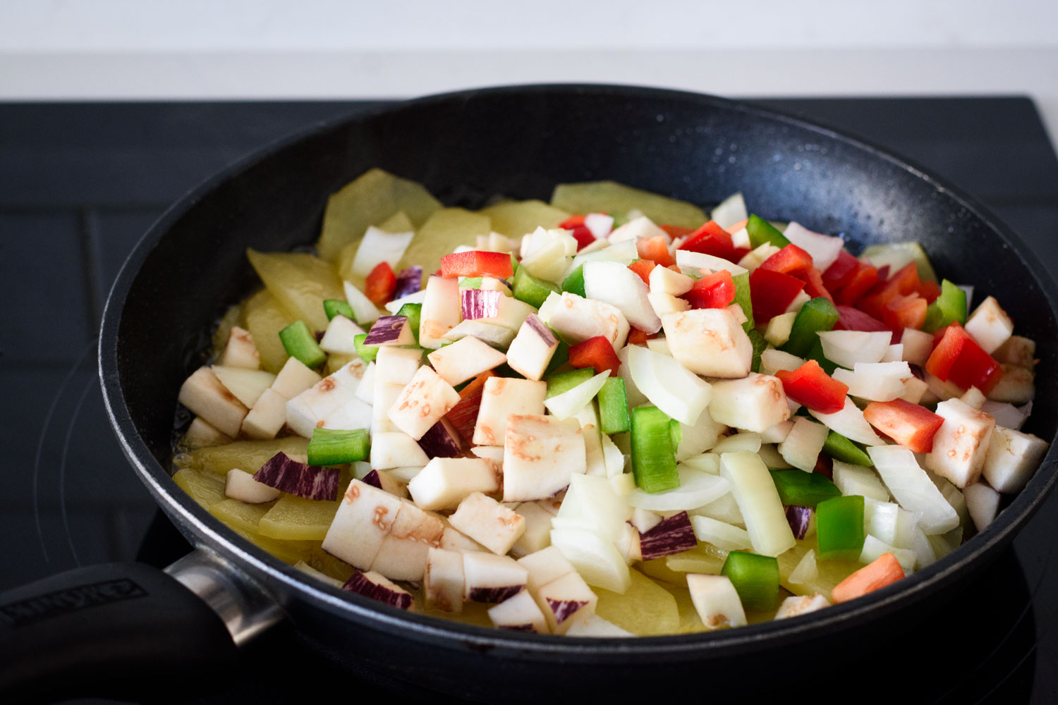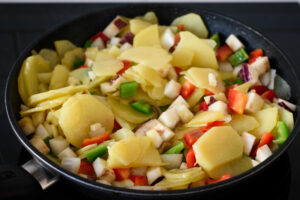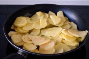 Ponemos una sartén al fuego con aceite de oliva y freímos las patatas durante 10 minutos.
