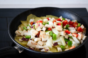 Añadimos las verduras, removemos y dejamos cocinar a fuego medio/lento hasta que queden bien hechas.